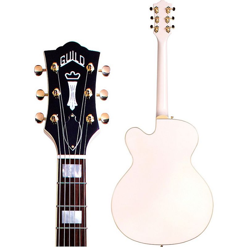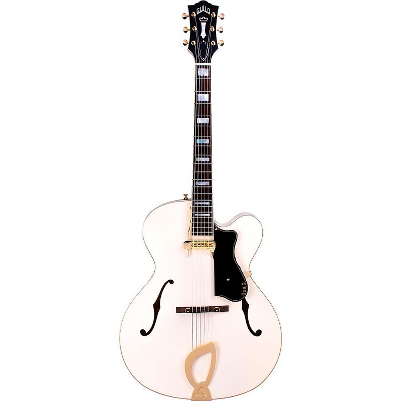Look no further than the Guild A-150 Savoy Special. This fully hollow guitar features an arched solid spruce top with arched maple back and sides. A period-correct, gold DeArmond Rhythm Chief 1100 floating pickup with adjustable pole pieces sets this guitar apart from other jazzboxes with its warm, quintessentially “jazz” tone that has come to define the genre as a whole. Featuring a set of discrete thumbwheel volume and tone controls tucked under the pickguard, the A-150 Savoy holds all the tools need to dial in tone while keeping its elegant minimalist aesthetic intact. Premium features include a special edition, eye-catching Snowcrest White finish, ivory binding, bound F-holes and headstock, mother-of-pearl block inlays, all gold hardware and a traditional Guild harp tailpiece. Includes a hardshell case.