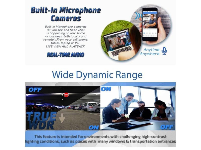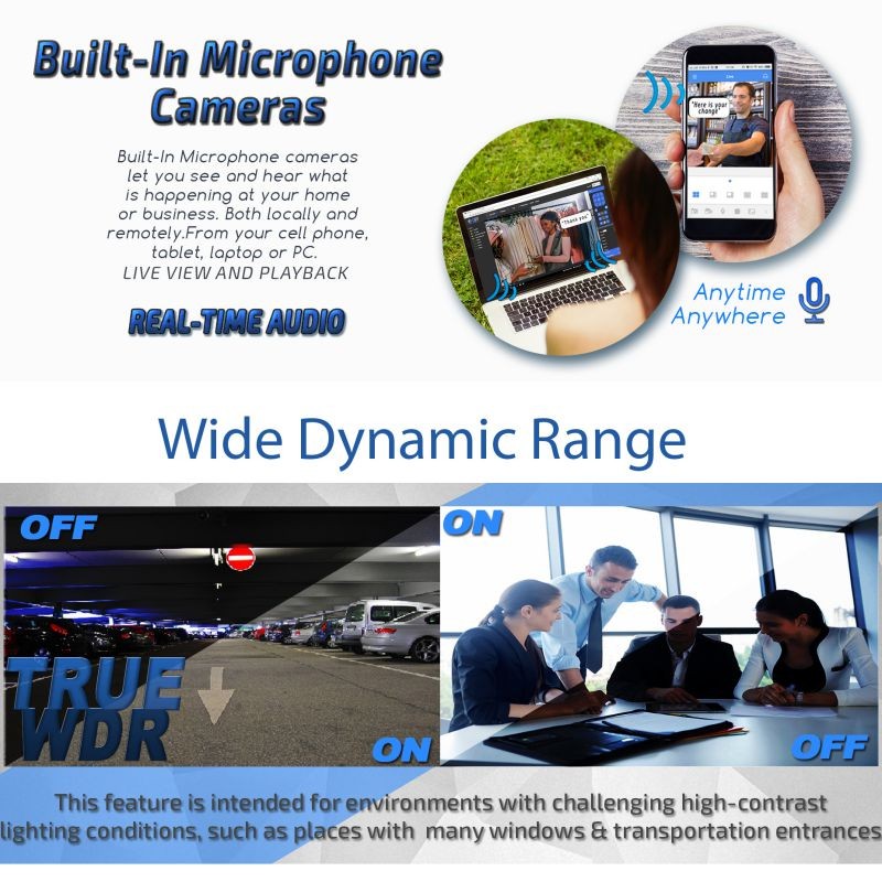 Each camera built-in microphone for audio recording, this can provide you with more information (such as voices) should an intrusion ever occur. It will also expand your security coverage beyond the camera's field of view and can help assist with interpreting events (even if they occur off-screen)