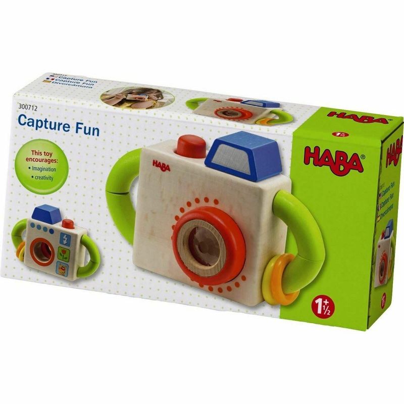 Give your young one a toy to "Capture Fun". This colorful wooden camera will have your child getting great shots every day. Push the red button to take the shot, look through the prism to see the crazy world! HABA is a German company with a long history of deep commitment to high-quality design, safety and social & environmental responsibility. This item is designed in Germany and made with strict care in China. Our employees regularly visit and inspect our partner suppliers and hold them to the highest quality standards and working conditions. Prior to market placement, the safety of the materials, the engineering process, the mechanical endurance testing and the actual use of our products are all tested and documented by independent, third party testing institutes. Cleaning Instructions: HABA recommends using a cloth lightly dampened with warm water. If you wish to disinfect the toy with a cleaning agent, use a small amount of either water and a mild dish soap or a water & vinegar essence mix. Both options work extremely well in destroying bacteria and cleaning wooden toys. After cleaning, wipe the toy dry with a clean cloth. Remember, Wood is a natural material that soaks in moisture. Do not ever submerse wooden toys in water or place in a dishwasher. Disinfectants (even organic baby wipes), should not be used as they can damage the water based protective coatings applied to protect the stains or paints beneath.