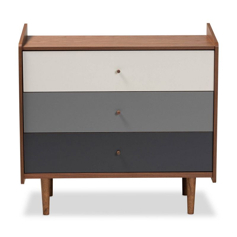 Add a creative highlight to your bedroom with the visually stunning Halden chest. Made in Malaysia, the Halden is comprised of sturdy wood showcasing a multi-color finish of walnut brown and a cool gray gradient. Three drawers provide ample storage for clothes and linens. Small, round drawer knobs add a minimalist touch. Requiring assembly, the Halden features angled sides and tapered legs for a chic, mid-century look. Brighten and elevate any bedroom with the striking style of the Halden chest.