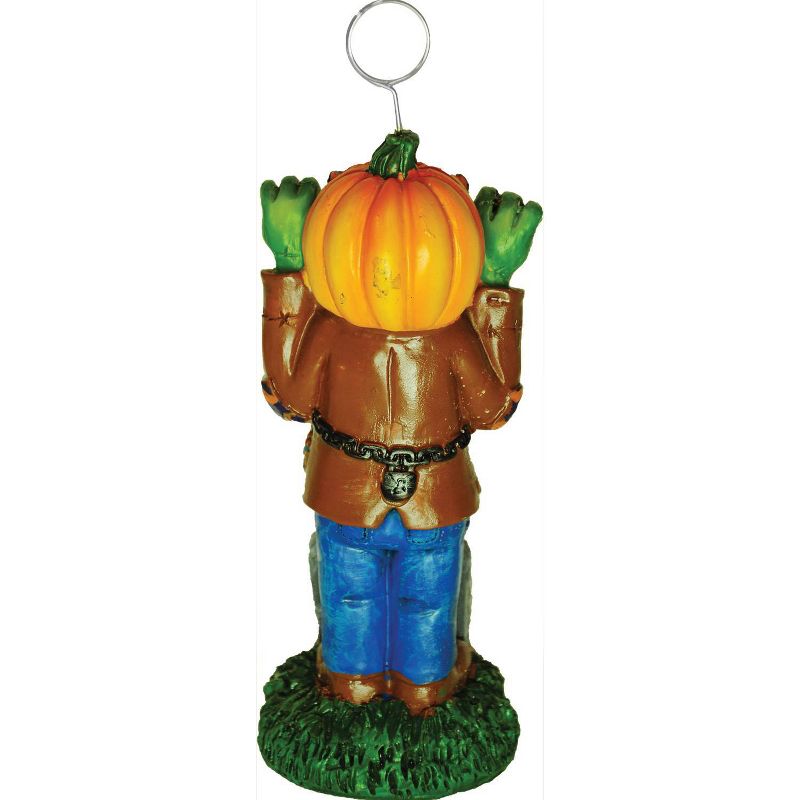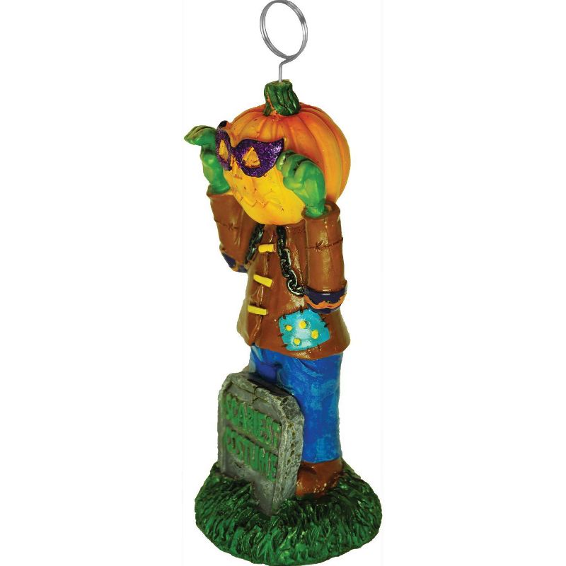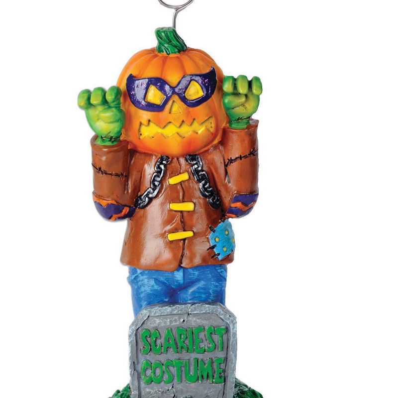 Scariest Costume party prop. A great trophy to give out for scariest costume at your Halloween party or event. A scary pumpkin headed man standing behind a gravestone with "scariest costume" written on headstone. Has metal prong at top of trophy to hold card or papered item. Full-color polystone resin. Product measures 6 inches tall.