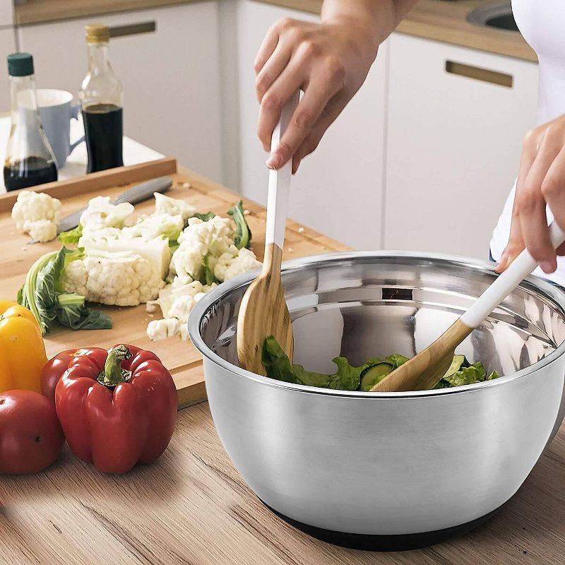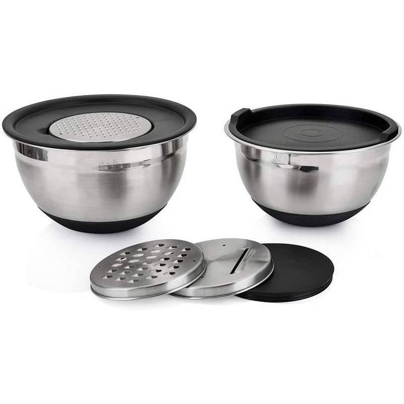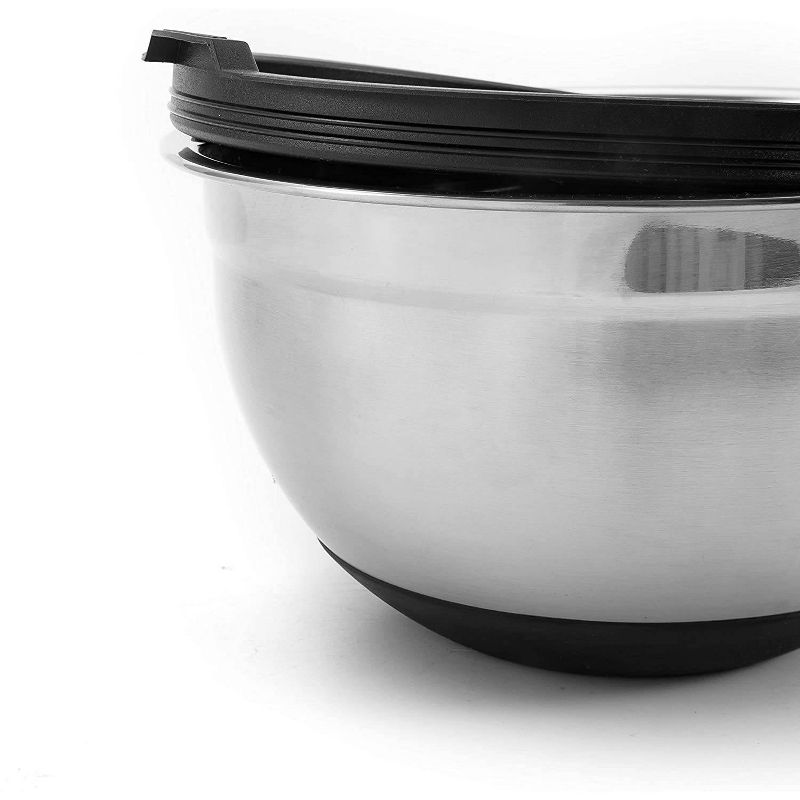 Mixing ingredients without any splash, the bowls are ideal for whisking eggs, mixing dessert, baking batters, cookie dough, tossing salads, and even marinating meats. Mess free grating and mixing. Bowls have plastic lids to store and keep food fresh. The non-slip silicon base, prevents the bowl from moving during use. Also prevents scratches to your counter top.