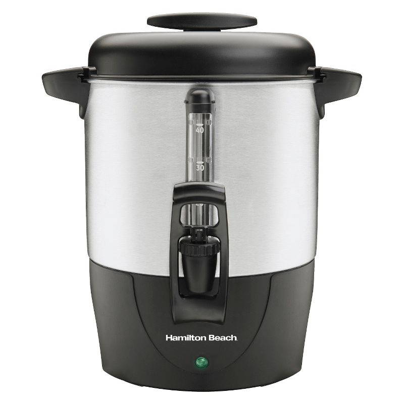 Need coffee for a crowd? The Hamilton Beach Coffee Urn, 40514R provides just the solution you've been looking for. The large 40-cupcapacity and easy to use one-hand dispenser serves coffee to a crowd and allows your guest to hold a plate of food in one hand, while dispensing coffee in the other. This Hamilton Beach Coffee Urn is easy to fill, easy to clean and you'll love the great tasting coffee. Dual heaters keep the coffee hot without overheating it. The durable metal exterior will provide years of services and won't rust or discolor. Coffee can be loaded directly into the filter basket(no paper filter needed) and lifts out for easy dishwasher cleanup. An added bonus is the water-coffee level indicator tube, which lets you know at a glance how much coffee is left in the unit. The Dispensing Hamilton Beach Coffee Urn also comes with an illuminated ready light, making this coffee urn a smart choice.