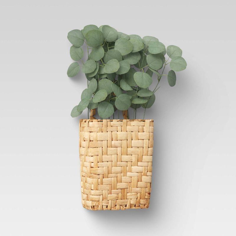 Add a touch of greenery to any wall in your space with this Hanging Woven Planter with Green Eucalyptus Plants Wall Sculpture from Thresholdâ„¢. This hanging plant arrangement features lush green eucalyptus leaves growing out of a naturally woven planter for refreshing style. The artificial design requires no maintenance, while the simple color scheme is easy to incorporate into your existing decor. Pair it with other hanging faux-plant arrangements to create your own plant corner in any space.