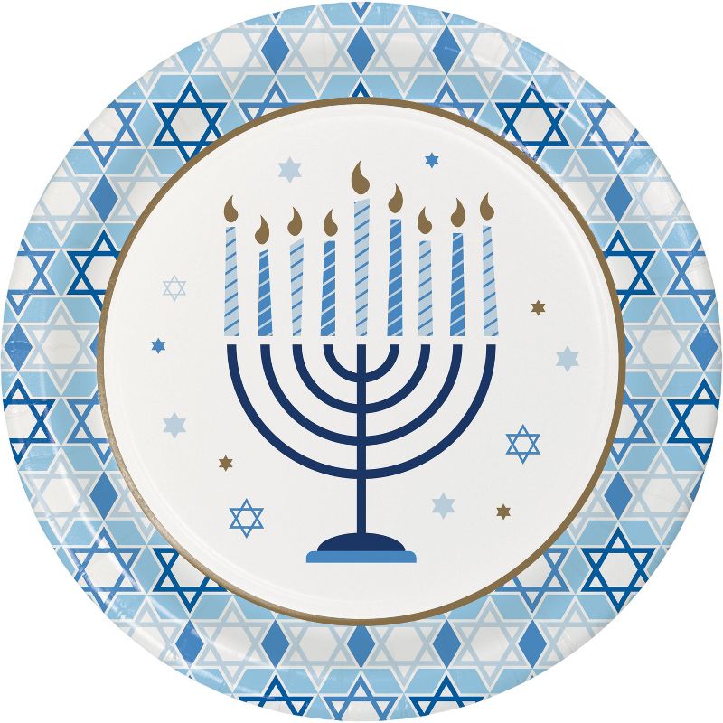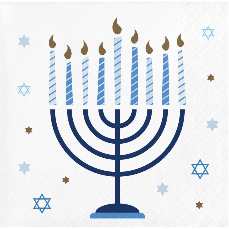 Each Hanukkah Celebration Deluxe Party Supplies Kit contains: 24 Hanukkah Celebration Paper Plates (9"), 24 Hanukkah Celebration Dessert Plates (7"), 48 Hanukkah Celebration Napkins (6.5"), 48 Hanukkah Celebration Beverage Napkins (5"), 24 Silver Rimmed Plastic Cups (12 oz), 3 Navy Blue Plastic Tablecloths (54" x 108"), and 24 Navy Premium Plastic Forks, Spoons, and Knives. Be prepared for all eight nights when you use the Hanukkah Celebration Deluxe Party Supplies Kit. The kit has all the paper plates and napkins you need to serve a meal to a gathering of 24 people. The party supplies feature menorahs and candles with a blue, gold and white theme. Celebrate the festival of lights in style!