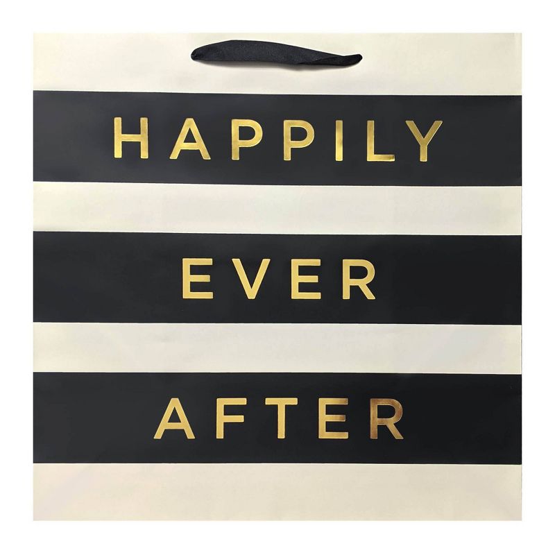 Raise your glass to the newlyweds! The black and white striped Happily Ever After Gift Bag by Spritz is sleek and sophisticated. The sweet and sincere message, "Happily Ever After," is beautifully displayed in gold foil lettering. A black elegant ribbon handle finishes this polished wedding look. If you’re not satisfied with any Target Owned Brand item, return it within one year with a receipt for an exchange or a refund.