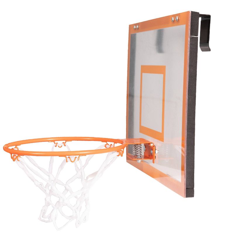 This WildKat Mini Basketball Hoop set is quick to set up and easy to play. Great for both kids and adults, whether you are playing in a bedroom, game room, or simply shooting hoops at the office, it provides competitive basketball action and fun no matter where you’re at. The 18'' x 12''backboard is made of clear polycarbonate with foam padded mounts on the backside that prevent scuffing or damage on your doors. The WildKat backboard, steel rim, nylon net, and universal frame mounts are easy to assemble and will fit over most doors. Includes 5-1/2'' diameter inflatable basketball, nylon net, 2 foam padded mounts, and an air pump. 180-day limited warranty.