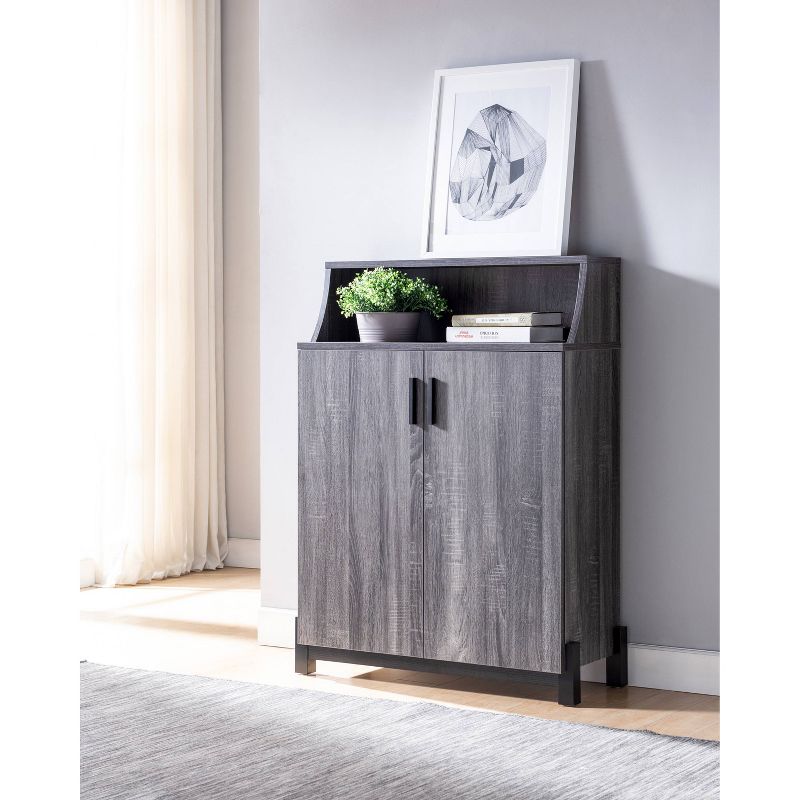 Minimalist, Mid Century Modern inspired style and ample storage make this cabinet a charming addition to any entryway. Constructed from sturdy MDF and Particle Board, the cabinet is showcased in two gorgeous finishes. Two doors conceal five shelves with storage space for up to 12 pairs of shoes, or other items, such as a book collection.