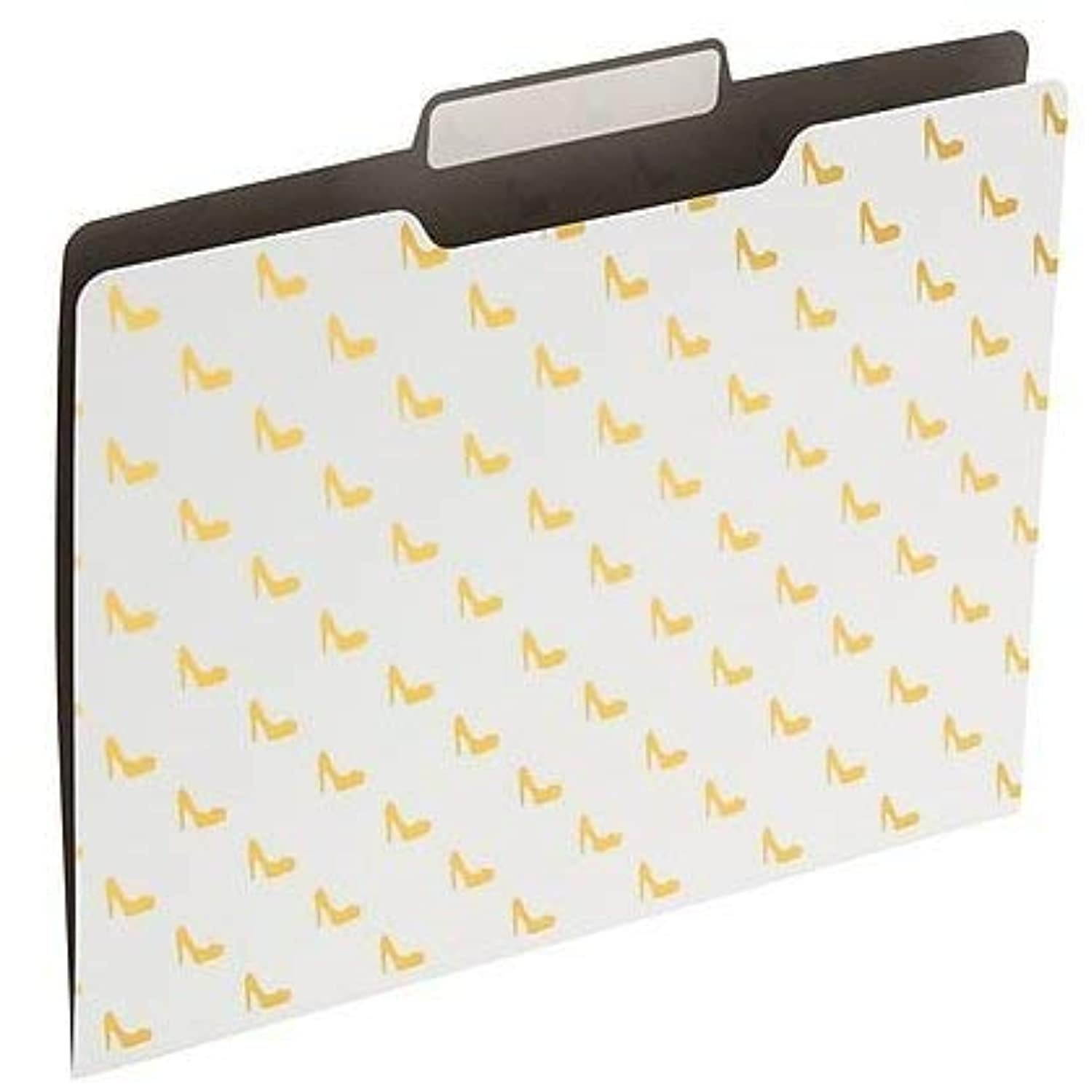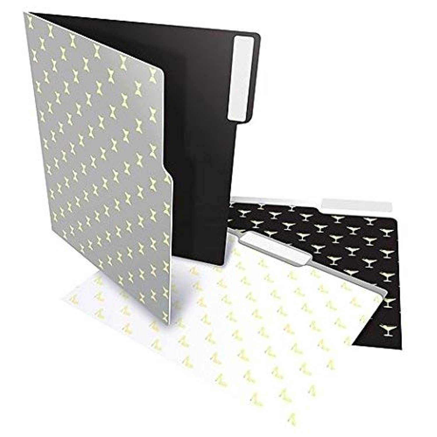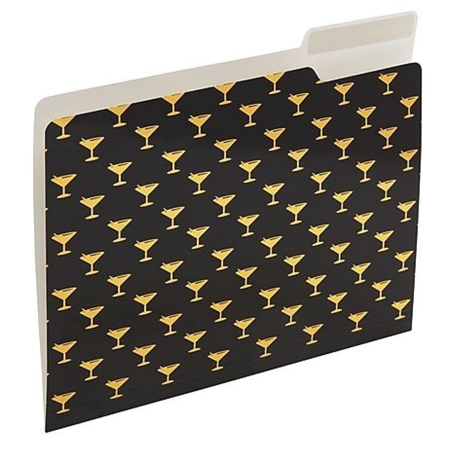 Set of 9 file folders is available in three different patterns. Each folder is made from a heavyweight card stock. Tabs are offset for easy sorting. Sized for letter paper. Three-tab file folders. Six (6) letter size folders, two of each design. Three (3) stylish designs; embossed gold martin glass, high heel, and bowtie.
