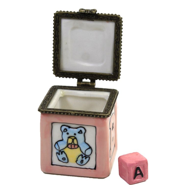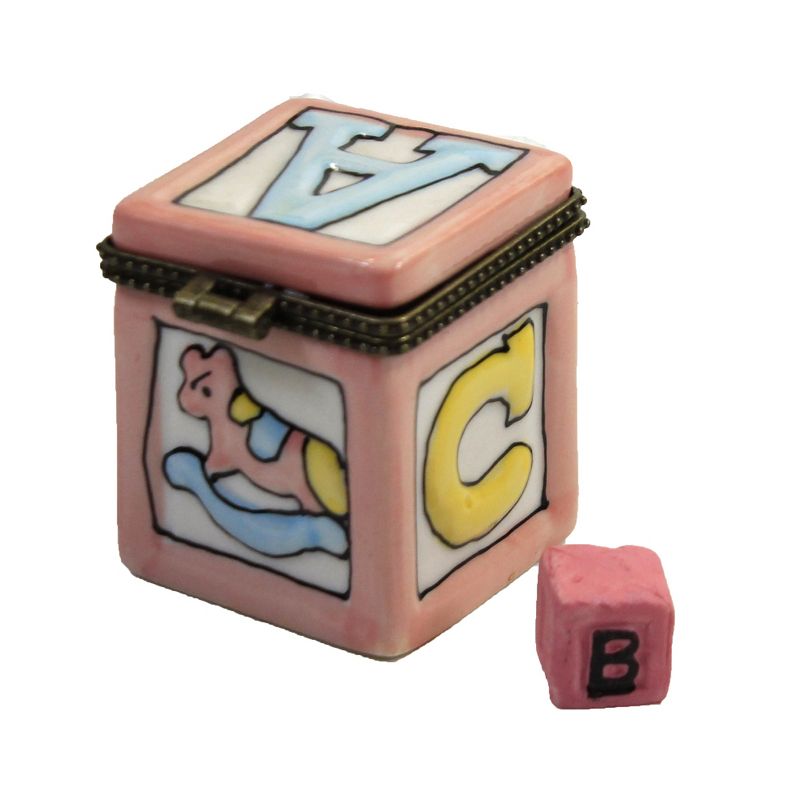 This Hinged Box Is Baby Block Accented With "Abc" Letter On Three Sides, A Teddy Bear On One And A Rocking Horse On Another.. New. Comes Packaged In A Box.. Measurements 1.75 In H X 1.5 In W X 1.5 In D. . Made Of Porcelain. No Assembly Required. Indoor Use Only. Imported