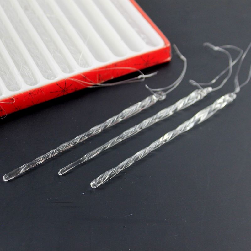 Clear Twisted Glass Icicle Ornaments.. New. Comes Packaged In A Box.. Measurements 5.5 In H X .25 In W X .25 In D. . Made Of Glass. No Assembly Required. Indoor Use Only. Imported