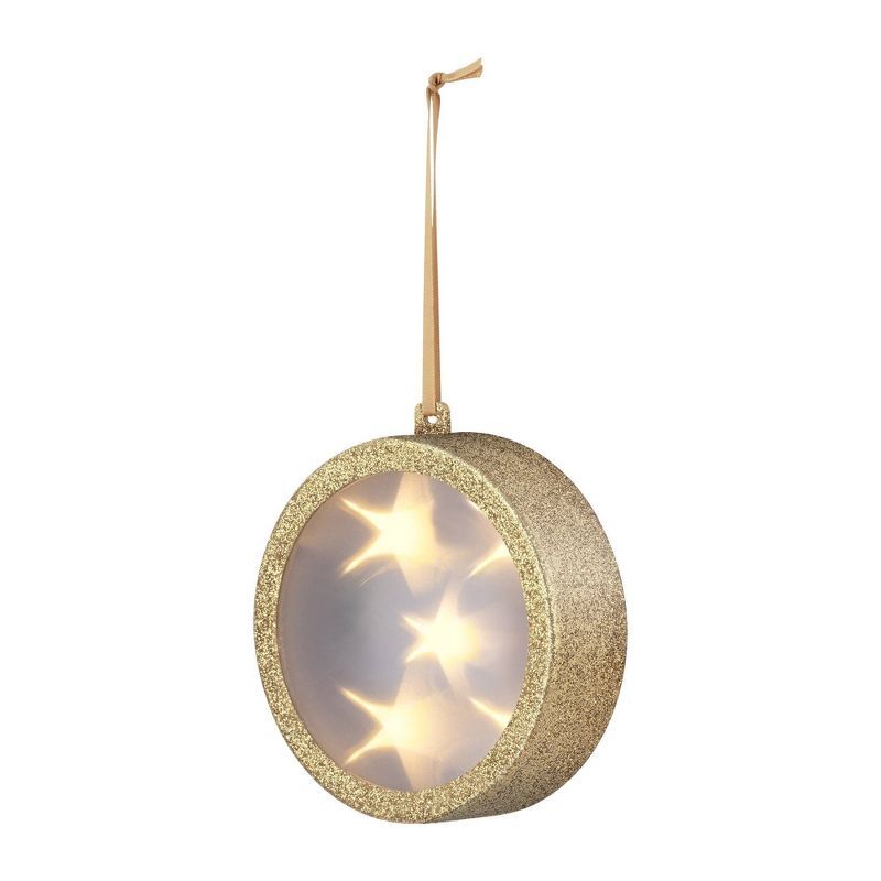 •Each plastic ornament features an opaque window that shines 5 warm white lights in a star holographic light display. A glitter exterior adds the finishing touch.