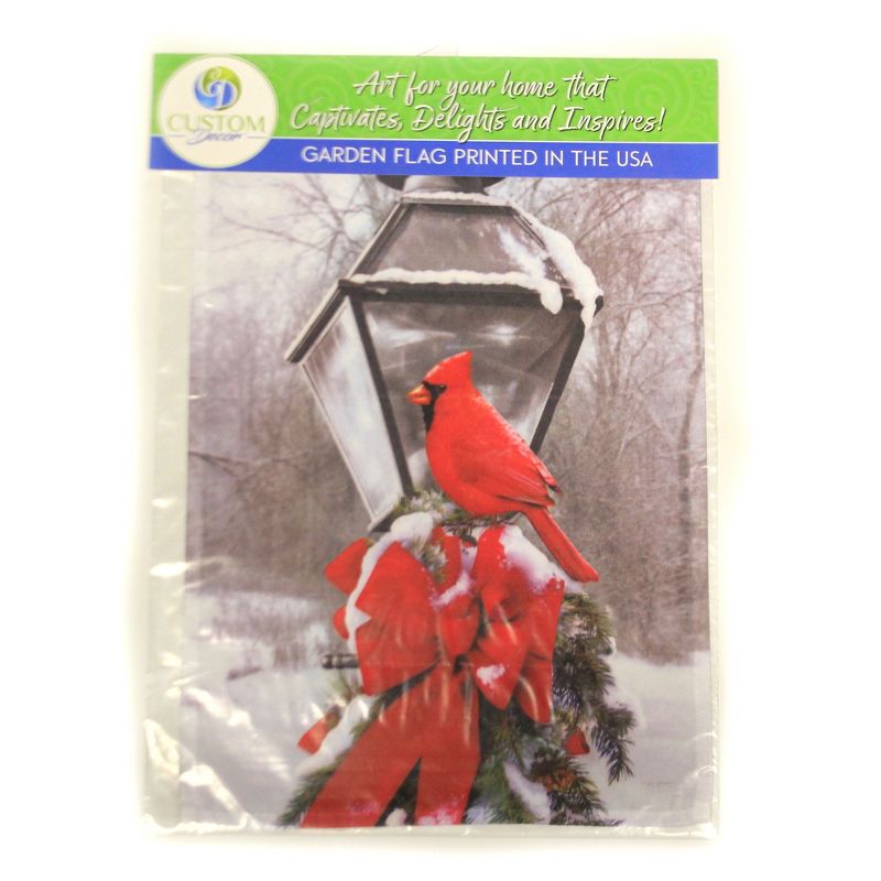 Welcome In The Season With A Gorgeous Double Sided Flag. Cardinal Sits On A Spray Of Greenery, Pine Cones And A Big Red Bow Which Is Attached To A Snow Covered Lamp Post. Background Is Bare Snow Covered Trees And Landscape.. New. Measurements 18 In H X 12 In W X .12 In D. . Made Of Polyester. No Assembly Required. Indoor Or Outdoor Use. Imported