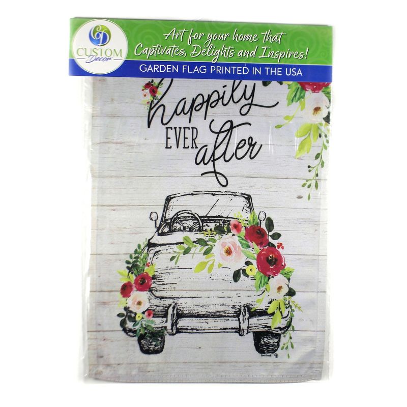 A Wedding Car With The Top Down With Flowers Around It Drives Off. "Happily Ever After" Is Printed On The Front With Flowers Around It.. New. Measurements 18 In H X 12 In W X .125 In D. . Made Of Polyester. No Assembly Required. Indoor Or Outdoor Use. Made In Usa