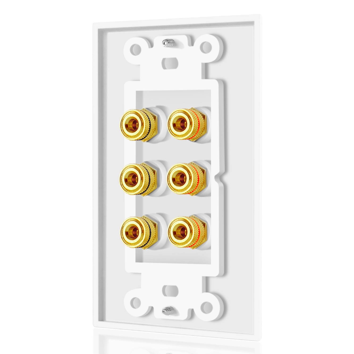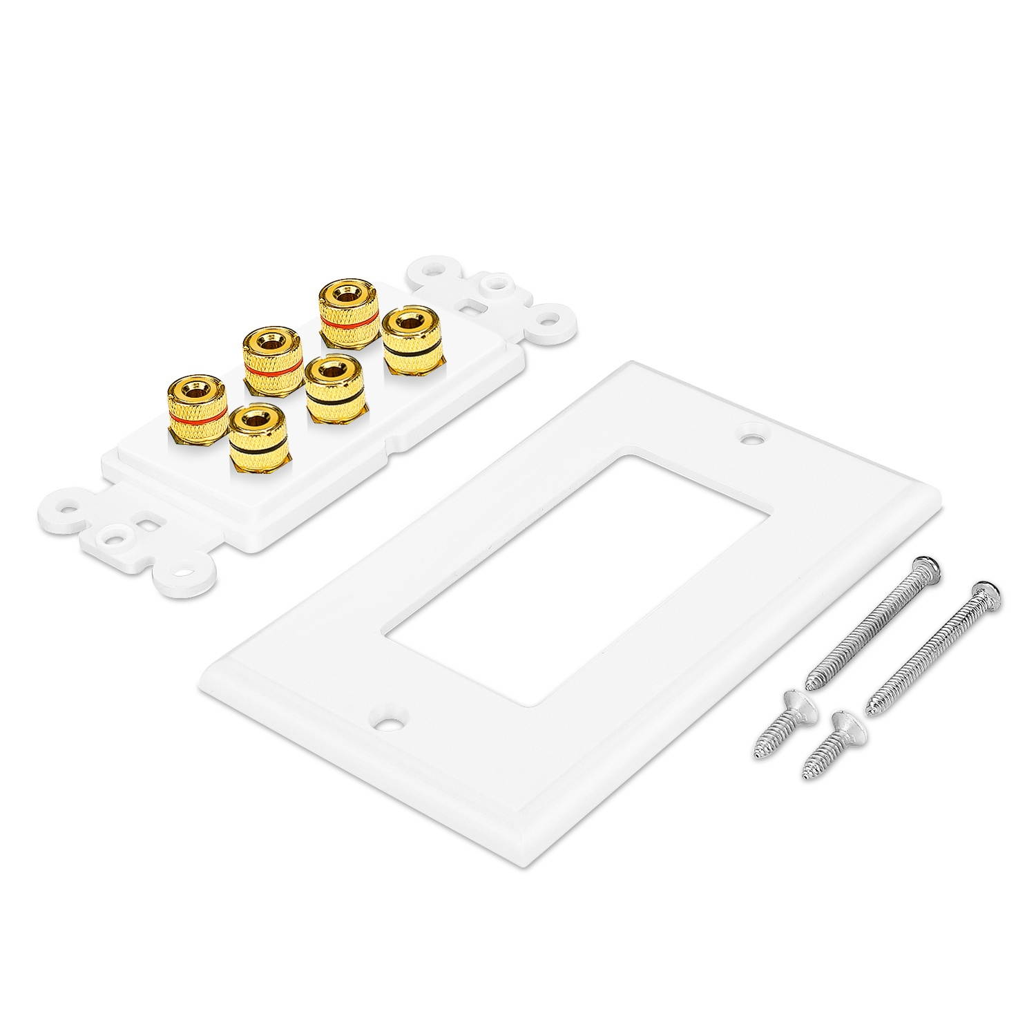 Cut down on cable clutter and make the back of your home theater system / media room environment as attractive as the front with this premium speaker wall plate. This home theater wall plate is an excellent accessory that allows for connections of up to 3 Speakers and is made out of high quality corrosion resistant 24K gold plated brass connectors. Lets you keep your cables organized out of sight and behind the wall. Don't just run your cables through a hole in the wall - give it a professional look with this Decora-style wall plate. It's easy to install and remove. Each wall plate includes all the screws you need to mount and eliminate the mess of wires strung along your baseboards. It contributes to a neat, finished installation. Clear labeling also simplifies room set up and configuration. It's designed to be used with banana plugs, spades or just bare wire and works with 5.1 7.1 7.2 channel speaker systems.