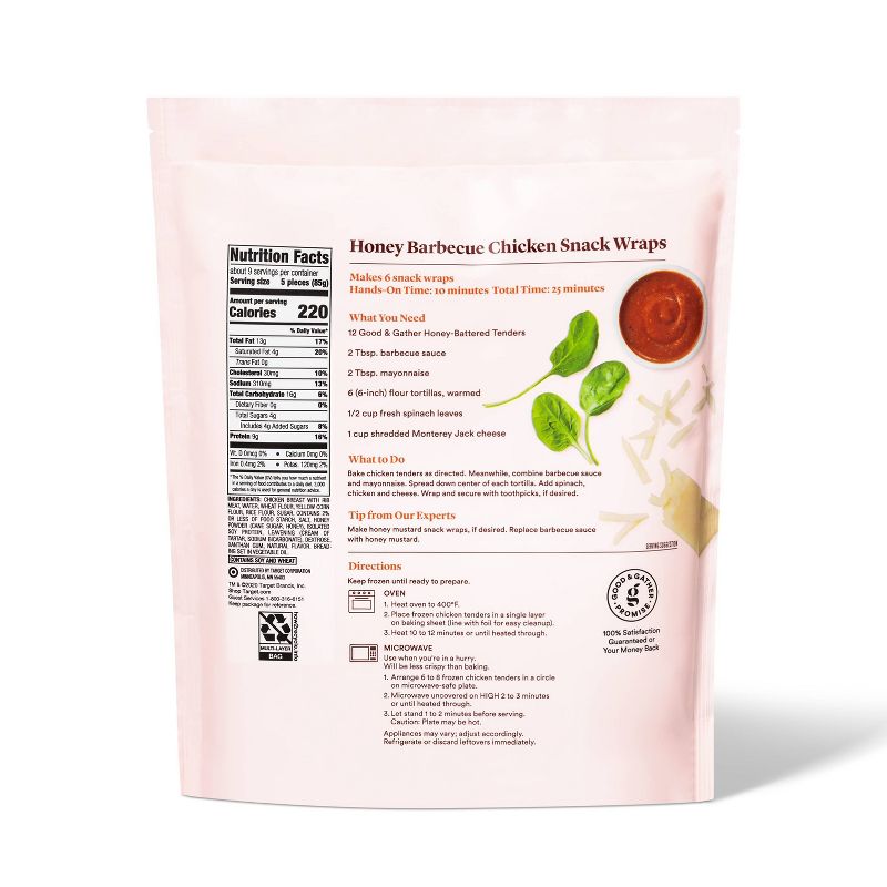 Whether you're simply looking for a satisfying snack or lunch, Good & Gatherâ„¢ Honey Battered Chicken Breast Tenders offer an easy way to enhance lunches, dinners and those in-between snacking needs. These shaped, battered chicken breast patties with rib meat are made with white meat chicken, raised with no added hormones or steroids* and no antibiotics ever. Fully cooked and ready to heat and serve so you can spend less time cooking and more time enjoying these tenders. Whether you dip them in some barbecue sauce for a simple snack or toss them on top of a salad of leafy greens and your other favorite toppings, you'll love adding these fully cooked chicken tenders to your routine.