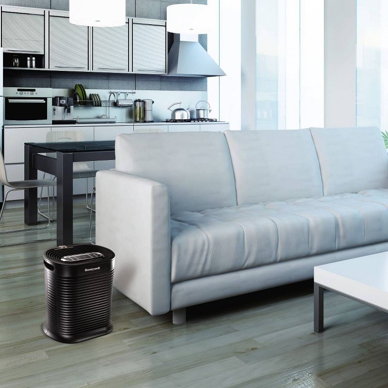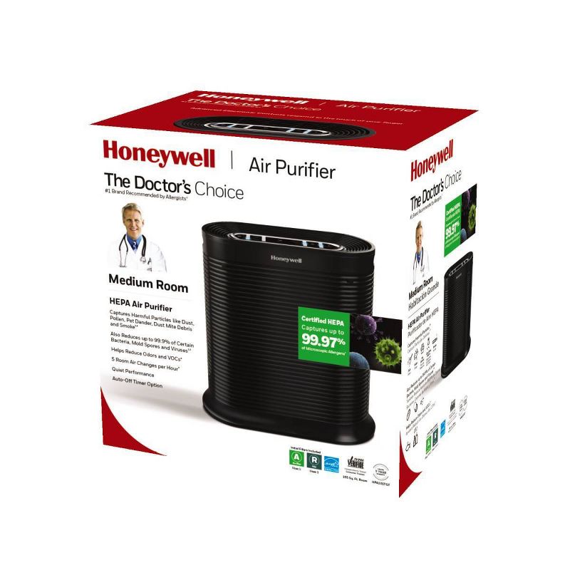 The Honeywell True HEPA Allergen Remover is designed for medium-sized rooms. This small console air purifier is compact and efficient and will fit most anywhere. The True HEPA filter effectively captures up to 99.97% of microscopic allergens as small as 0.3 microns, from the air that passes through the filter. It also reduces odors, VOCs (volatile organic compounds) and certain germs (Based on independent testing report 100954017COL-001). How the air purifier works: a fan continuously draws in airborne pollutants. The dirty air passes through the activated carbon pre-filter that traps large particles and absorbs VOCs, gases and odors. The air then passes through the HEPA filter that captures the really small particles, such as dust, pollen, pet dander, smoke, mold spores and more. The filtered, cleaner and fresher smelling air is then circulated back into the room. Honeywell Air Purifiers are the #1 brand recommended by Allergists (Based on the Nov. 2014 Cascade Survey Research results). To ensure stated product performance, use only Certified Honeywell Replacement Filters.