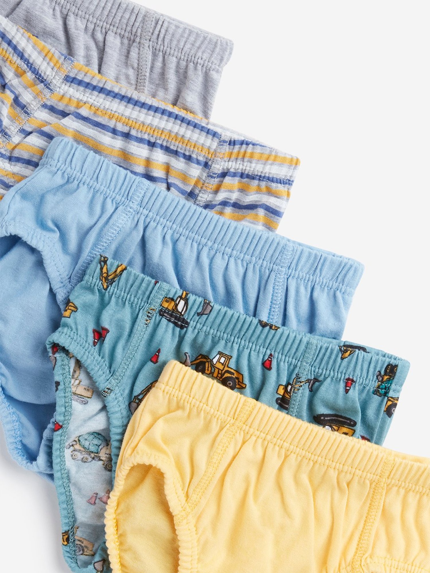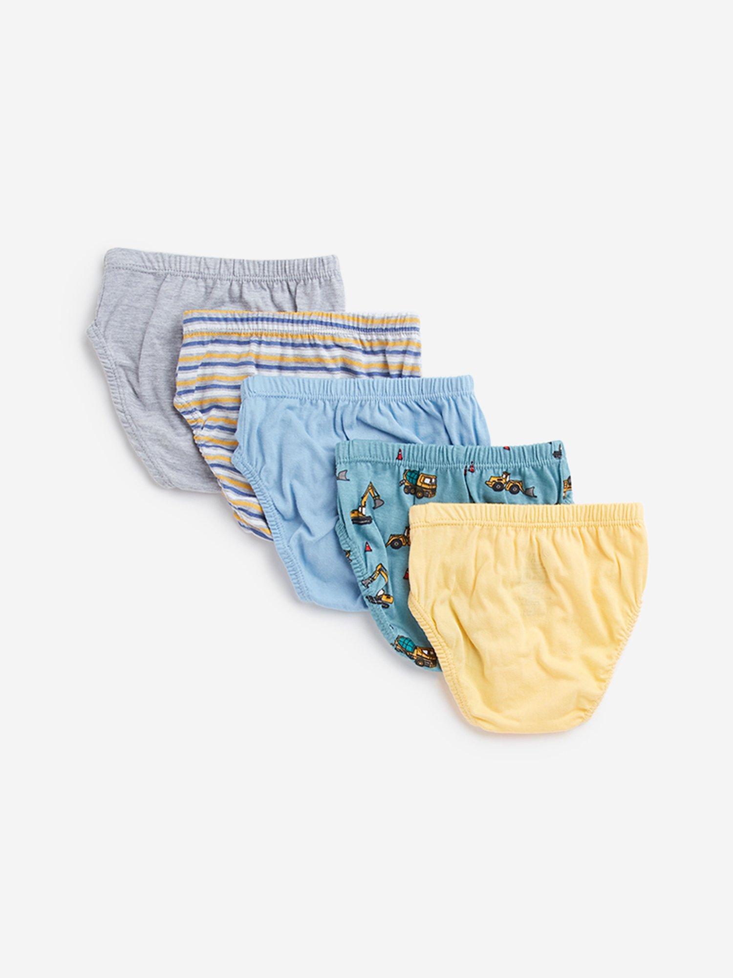 HOP kids launches this set of five briefs. Made from a cotton-stretch fabric, the pack features colour variants of yellow, blue, grey melange, green and multicolour. The playful prints lend a fun twist.¿