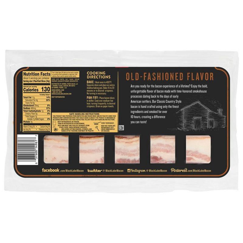 Try HORMEL® BLACK LABEL® Classic Country Style Thick Cut Bacon to enjoy the bold, unforgettable flavor of bacon made with time-honored smokehouse processes dating back to the days of early American settlers. HORMEL® BLACK LABEL® Classic Country Style Thick Cut Bacon is hand-crafted using only only the finest ingredients and smoked for over 10 hours, creating a difference you can taste! Use as the hero of your breakfast, on burgers, sandwiches, sliders, appetizers or any of those bacon recipes you've been dying to take to a whole new level. HORMEL® BLACK LABEL® bacon is serious bacon for serious bacon lovers — or anyone ready to become one!