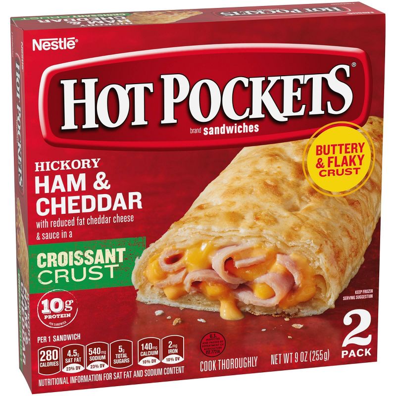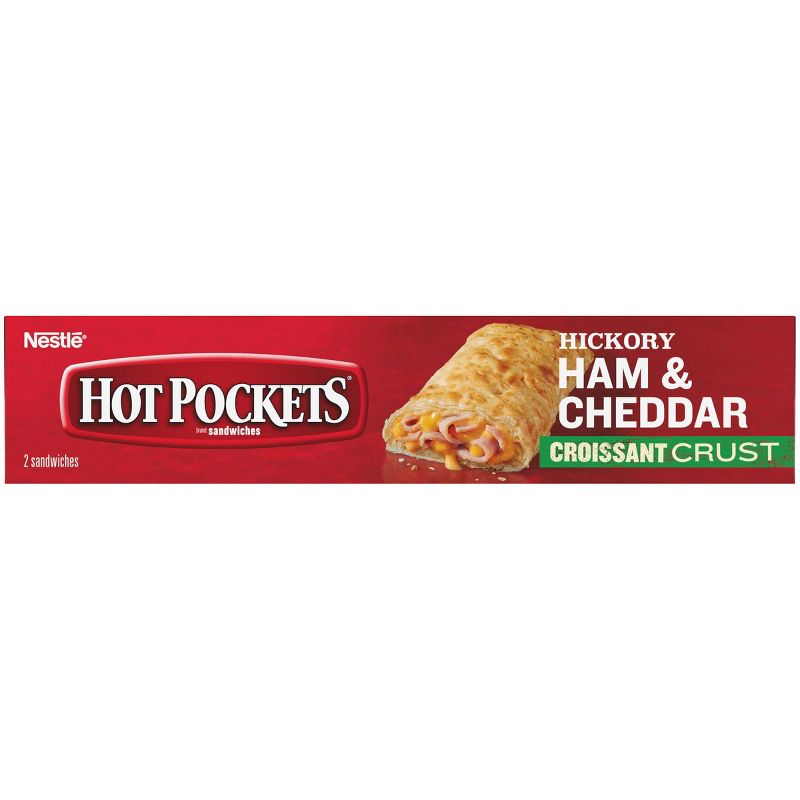 Hot Pockets Hickory Ham and Cheddar Croissant Crust Frozen Snacks are a quick and easy choice for any time of day. These Hot Pockets come stuffed with hickory ham and reduced fat cheddar cheese, wrapped in a flaky croissant crust. These ham and cheese Hot Pockets offer a good source of protein with 9 grams per serving and are made with no artificial flavors and 100% real cheese. Microwave prep makes a Hot Pockets ham and cheese croissant an ideal choice when you're short on time or on the go. Keep ham and cheddar Hot Pockets in the freezer until you're ready to cook.