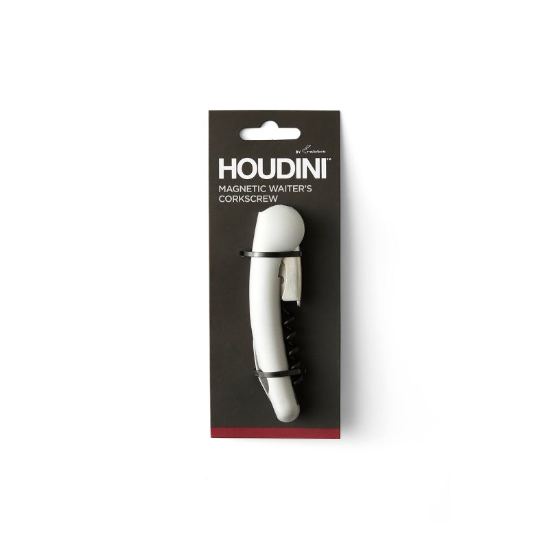 Houdini's waiters corkscrew is perfect for opening your favorite wine. The waiters corkscrew is preferred by waiters and sommeliers. Features a handy magnet which allows storage on the fridge. The corkscrew pulls all cork types with ease. Built-in foil cutter removes foil cap. Easy to carry, ideal for travel. Cheers to that!