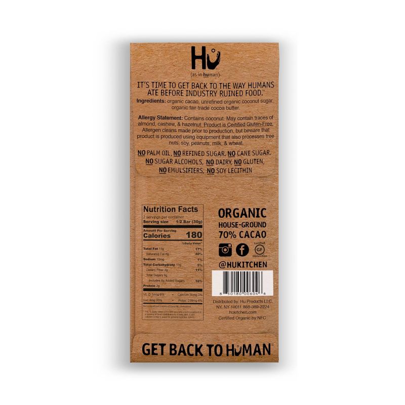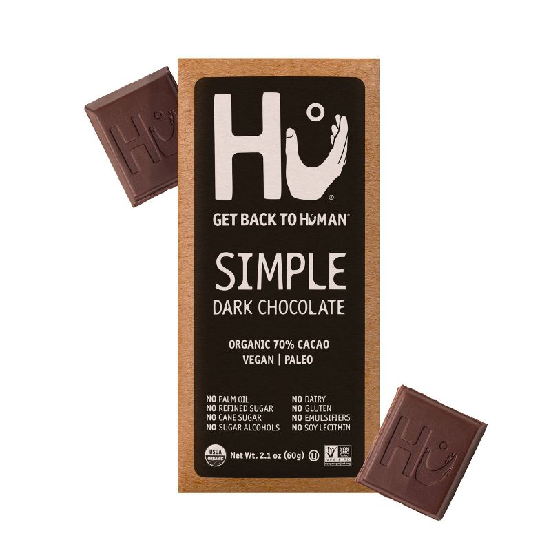 The one that started it all. Hu’s Simple Dark Chocolate bar is made with only 3 simple, organic ingredients. Simple Dark uses organic house-ground 70% cacao and subtle caramel notes from organic unrefined coconut sugar. Ingredient lists have never been so simple: organic cacao, organic unrefined coconut sugar, and organic cocoa butter. Delicious dark chocolate made with No Weird Ingredients. Ever. Hu Chocolate.