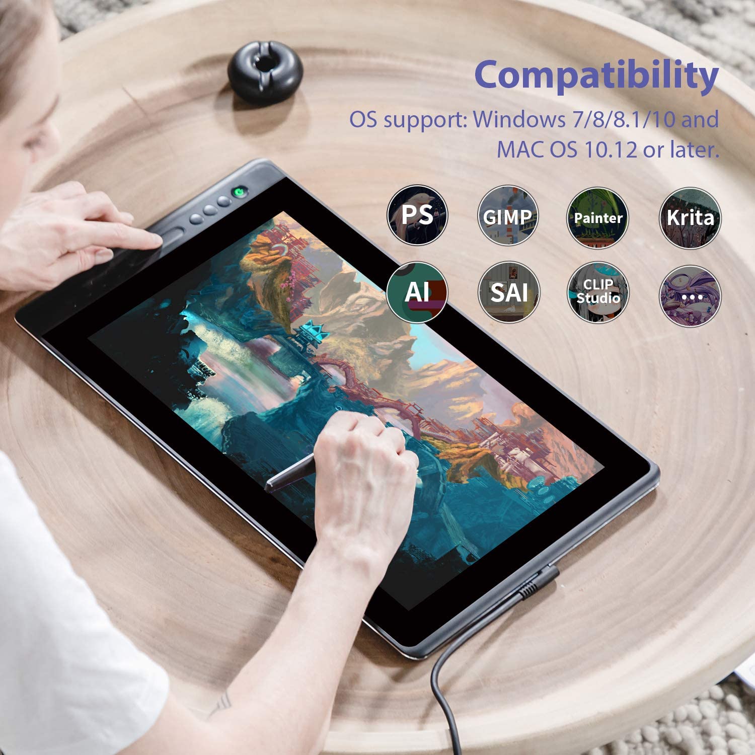 Kamvas Pro 16 is compatible with Windows7 or later, macOS 10.12 or later, it also compatible with Chromebook Chrome OS 88 or later. You could draw with Kamvas Pro 16 in any creative software including Illustrator, Photoshop, Painter, SAI, Krita, Mediband, and so on!