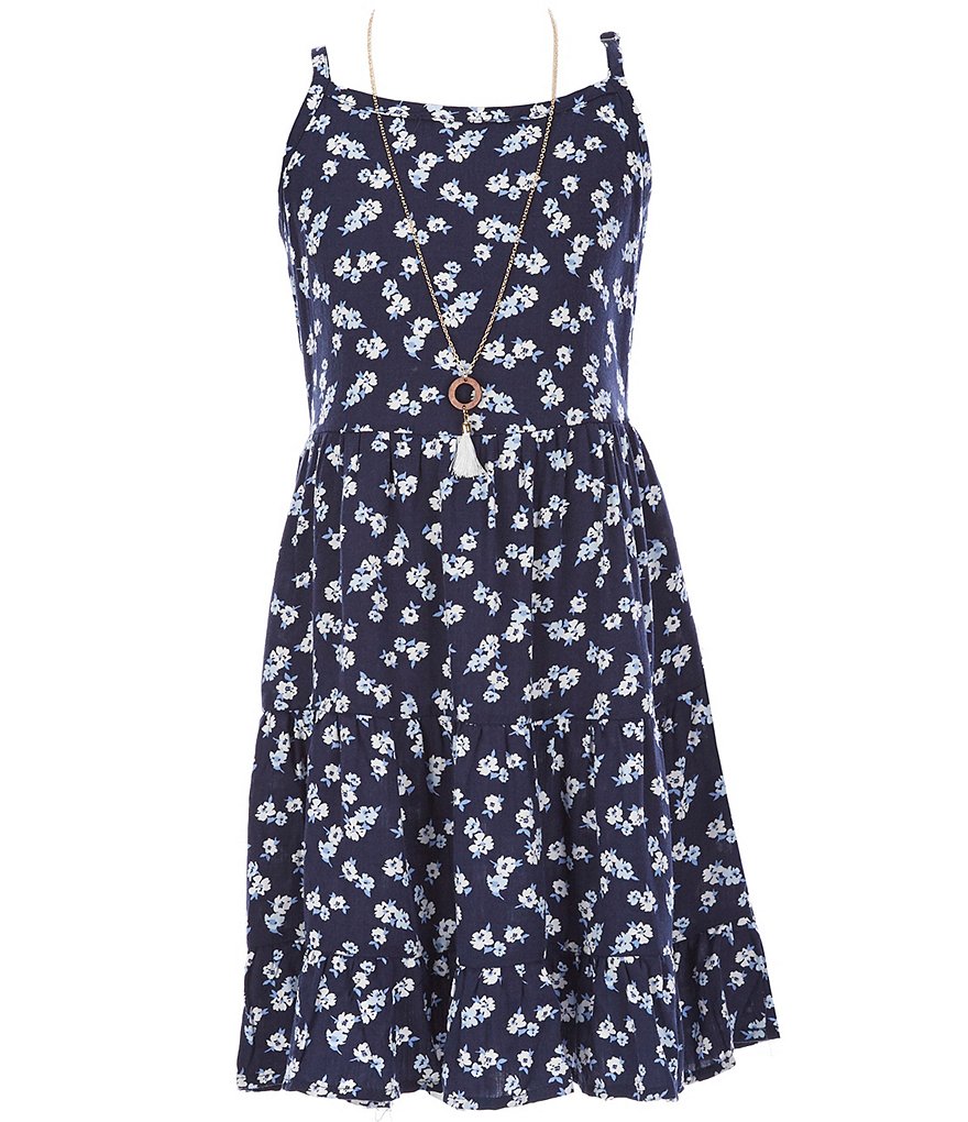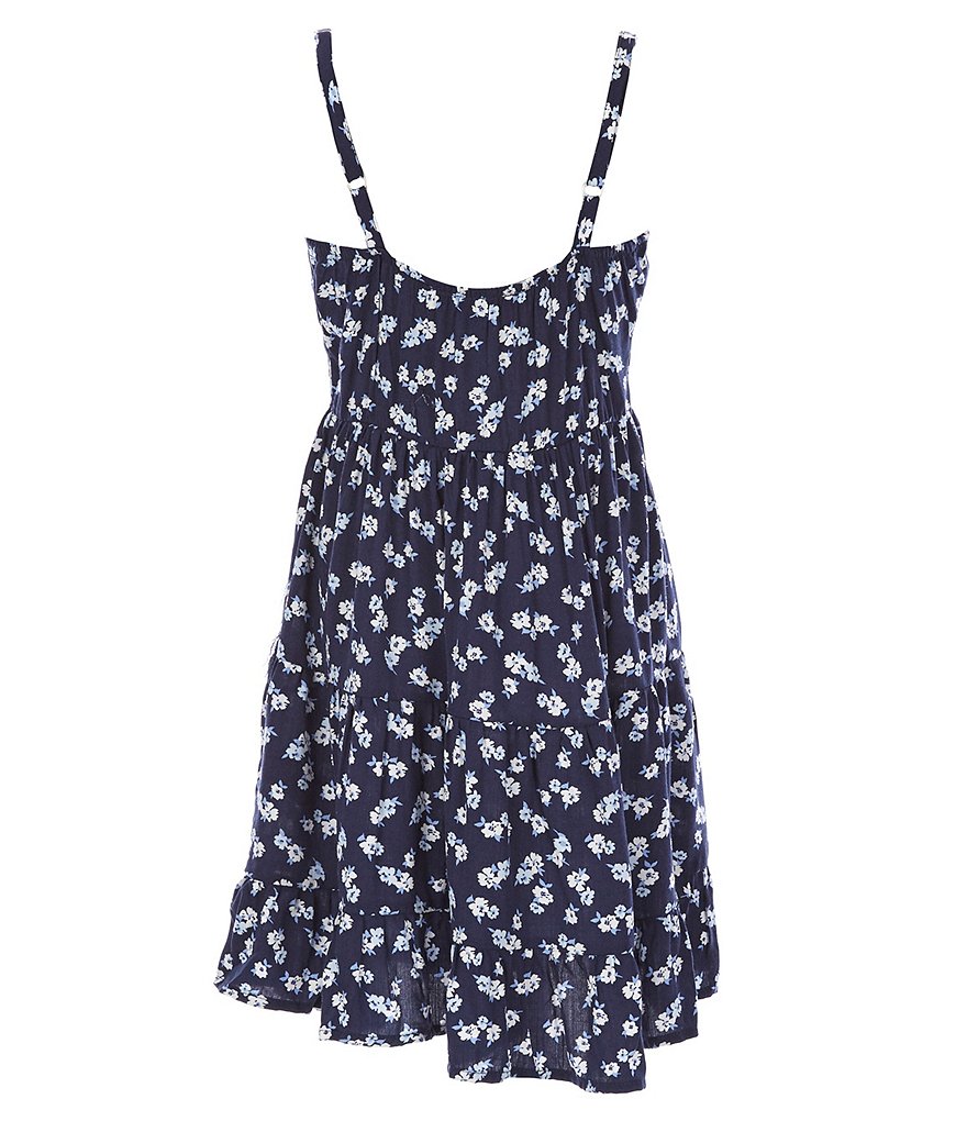 - printed sleeveless dress with a square neckline; spaghetti straps; pullover styling; and a full, pleated skirt with ruffled hem