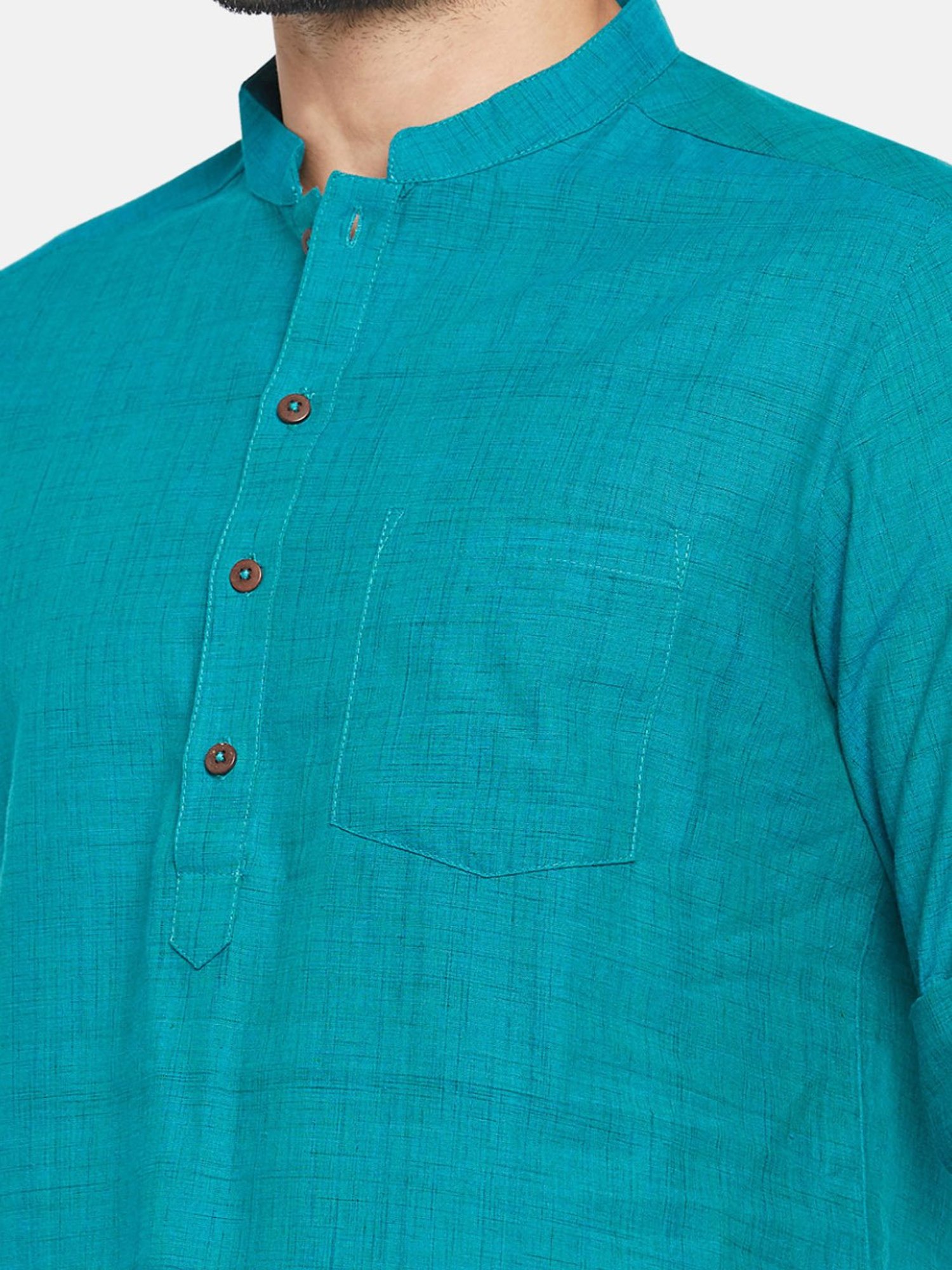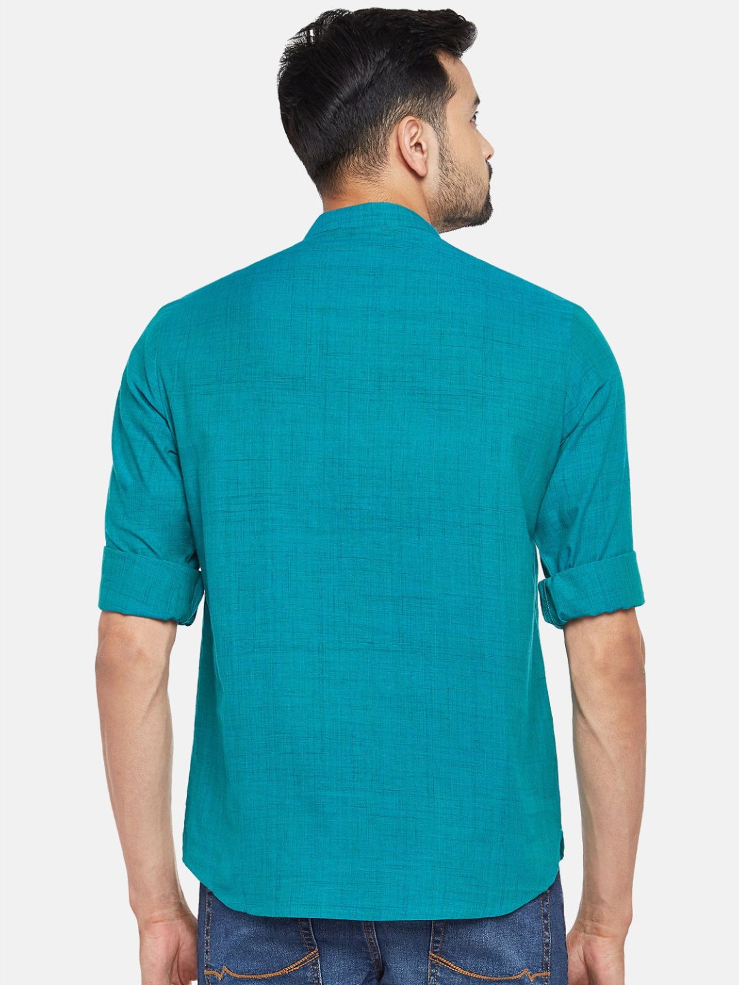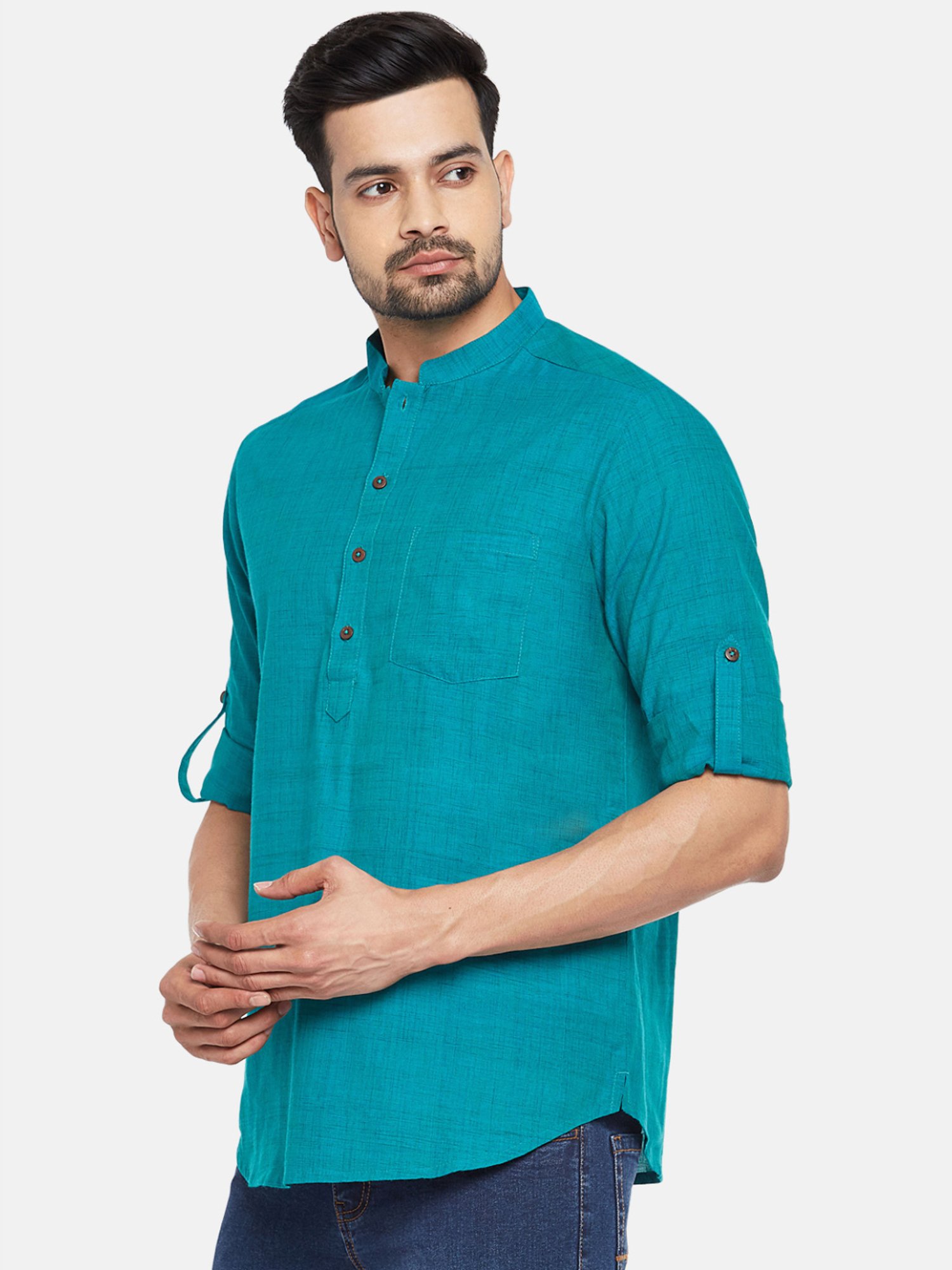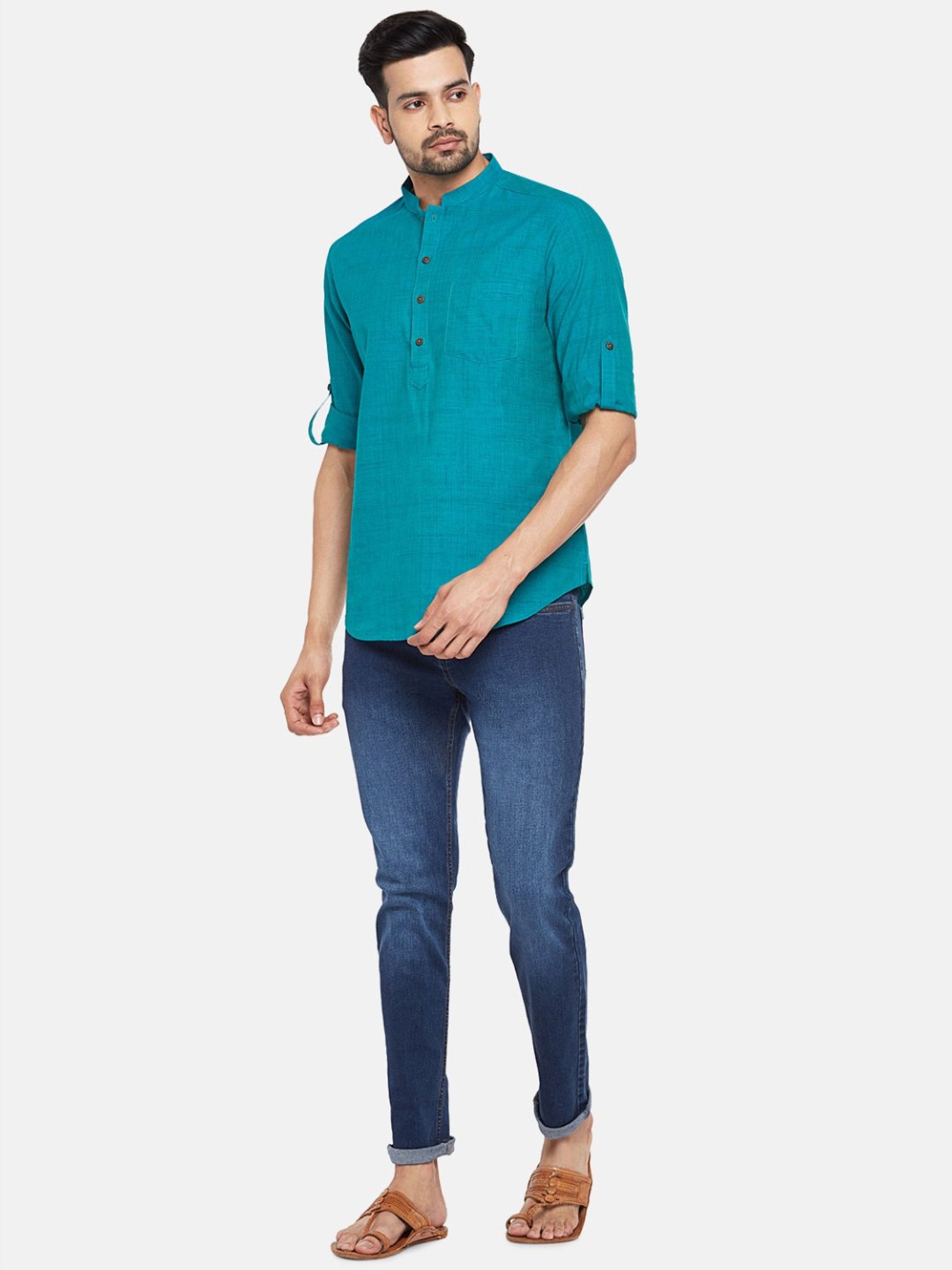 Look your best by wearing this turquoise regular fit short kurta from Indus Route by Pantaloons. Crafted using premium quality cotton fabric, it will be very soft to the skin. The mandarin collar augments its design. Exuding full sleeves, it is sure to fetch you compliments from all.