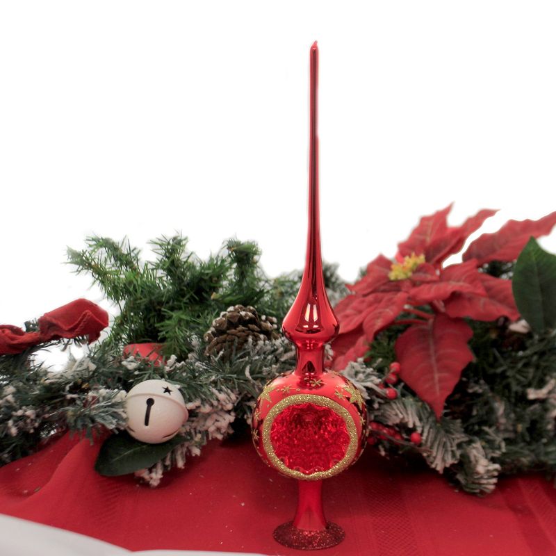 A Shiny Red Single Reflector Ball 13.00 Inch Tree Topper With Gold Glittered Stars And Starbursts. The Deep Red Reflector Outlined In Gold Glitter Adds Brilliance And Dazzle To Your Holiday Tree Or Table.. New. Measurements 13.00 In H X 3.00 In W X 2.50 In D. . Made Of Blown Glass. No Assembly Required. Indoor Use Only. Imported. Designed and produced in the Bavarian town of Neustadt bei Coburg, each individual Inge-Glas glass ornament is hand-blown, filled with a pure silver solution which then covers the inside of the glass and hand-painted. Up to 30 steps are necessary to give an ornament its final look. Every single ornament is painted by the same painter from the first to the last painting step. The Star Crown® is a guarantee that you are holding a authentic, unique creation from Inge-Glas® in your hands: a glass ornament manufactured in Germany according to centuries of tradition.