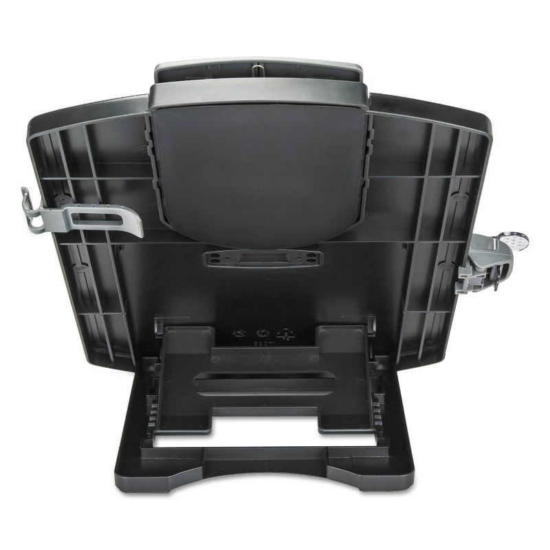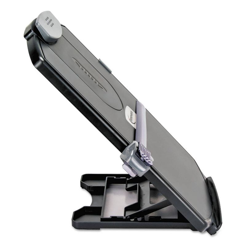 Holds both A4 and letter size documents. Four arm settings for optimal viewing. Grooved ledge and clips holds up to 25 sheets of paper. Includes removable see-through line guide and pen clip. Folds flat for easy storage. Adjustable for various viewing angles. Holds: A4; Letter; Mounting: Free Standing; Sheet Capacity: 25; Depth: 1.38". Manufacturer's limited one-year warranty.