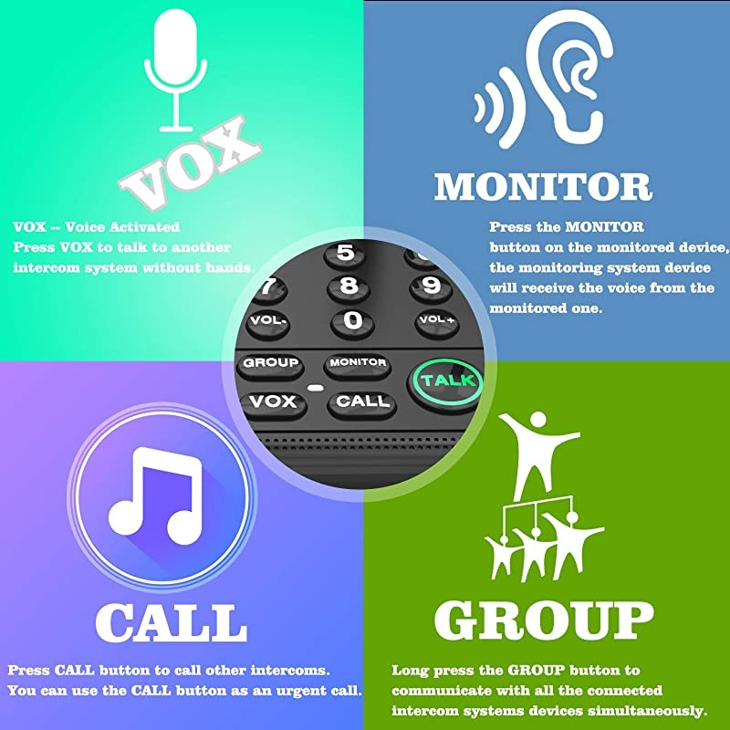 ***** **********Best Quality Guranteed. *****Excellent SignalHome intercom system with clear sound quality and long range. An enhanced signal helps ensure crisp sound quality. Ideal wireless intercom system for home! *****10 Channels10 channels and 3 digital codes in a secure wireless intercom system. *****Easy To Set Up and UseNo installation requirement, you can mount the unit on the wall, or place them on a table, operates whenever there is an existing 100-240V AC plug in your home or office, there is no fee, no wiring, do not need change the original structure, receiving reliable, working stable.