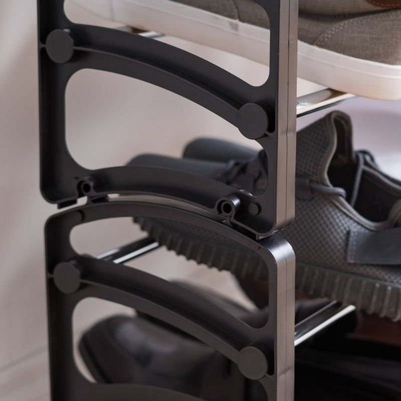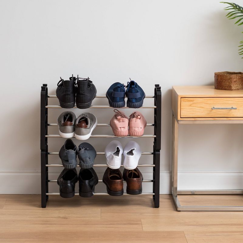 Keep your shoe accessible and organized with this lightweight stackable metal shoe rack. Closet shoe rack organizer holds up to 6 pairs of shoes. Features interlocking joints for secure stacking to make 4-tier shoe shelf. Keep your closet, bedroom, mudroom or entryway away from messy shoe clutter. The shoe rack holds up to 4.4 lbs. Indoor use only. For safety, do not allow children to climb on or play with the product.