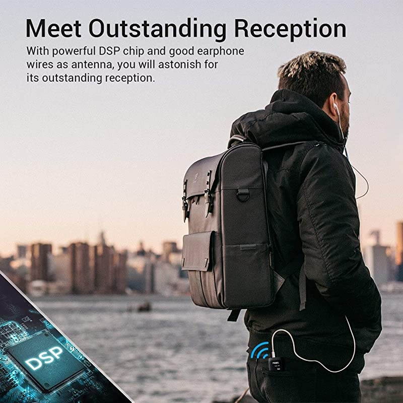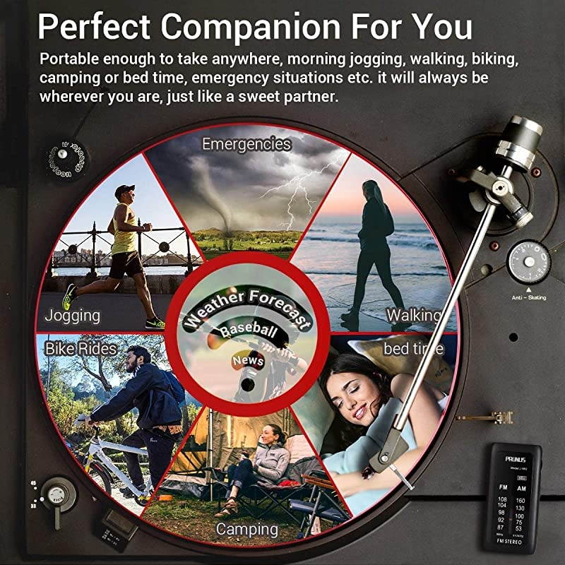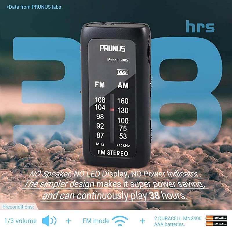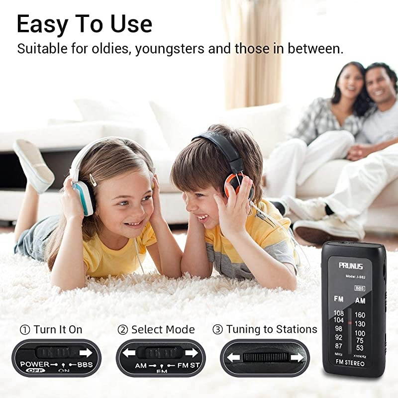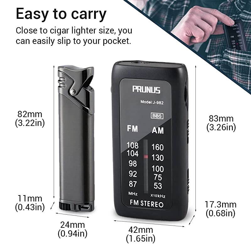 **********Excellent Reception Equipped with high-quality DSP chip, and earphones worked as antenna, ensure more stable and more clear signals, NO need to pull out the antenna like other analog pocket AM/FM radios*****Transistor Radio with Pocket SizeMeasures only 1.65 * 0.68 * 3.26 inch, almost the same mini size as cigar lighter, pretty lightweight to hold in hand, carry the AM/FM walkman radio to start your jogging, riding, walking, camping, etc*****Easy To UseJust three buttons to pick up your favourite stations, very easy to operate like old portable radio, suitable for both the old and the young*****AAA Battery OperatedOperated by dual AAA batteries (not included), due to the simple feature, helps to extend the battery lifespan to 30 hours or more*****Stereo SoundOn the mode of FM ST and BBS at the same time, delivers rich stereo sound with deep bass, with 3.5 mm earphones socket, enjoy the fantastic time by yourself