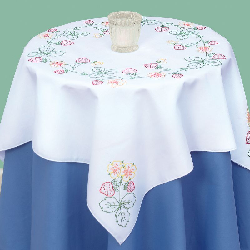 Jack Dempsey-Stamped White Perle Edge Table Topper. Create a beautiful table topper using this great kit. The stitching designs have been stamped using ink that washes away with any liquid and the fabric is a cotton/poly blend broadcloth. This package contains one 35x35 inch square table topper, instructions for completion and care and a complete list of DMC floss requirements. Hoop, needle and floss sold separately. Design: Strawberries. Made in USA.