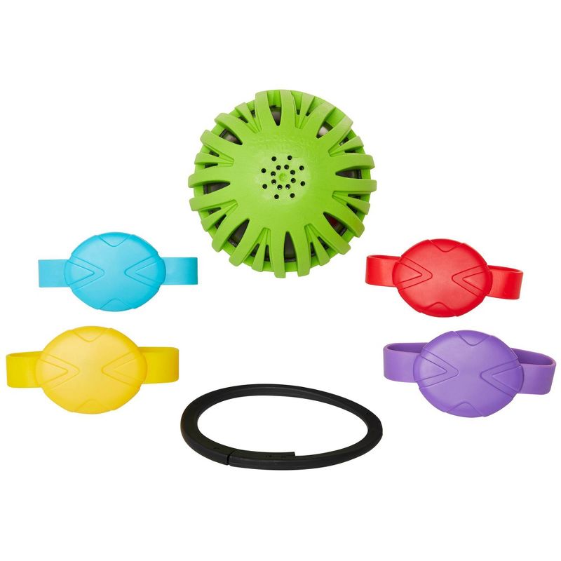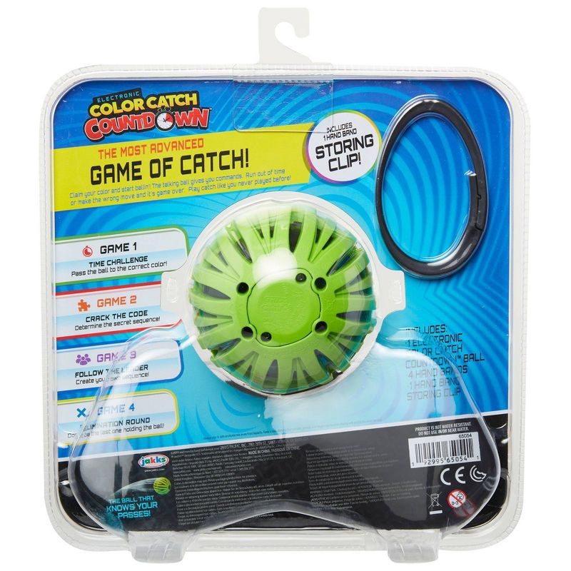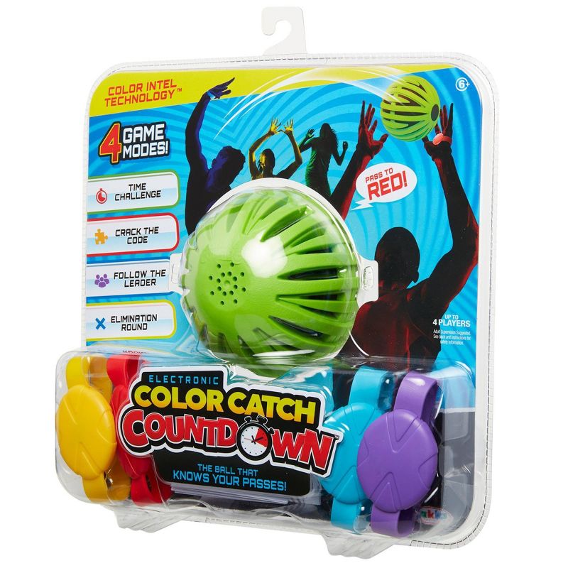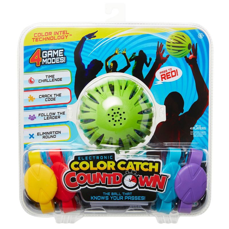 Follow the commands with your color coded bands! Color Catch Countdownâ„¢ puts your skills to the test. Put on your color coded band and let the ball take control. Color Catch Countdownâ„¢ features RFID technology that makes explosion noises when the ball is tossed incorrectly, counts how many correct passes were made, and much more! Color Catch Countdownâ„¢ is guaranteed fun for hours.