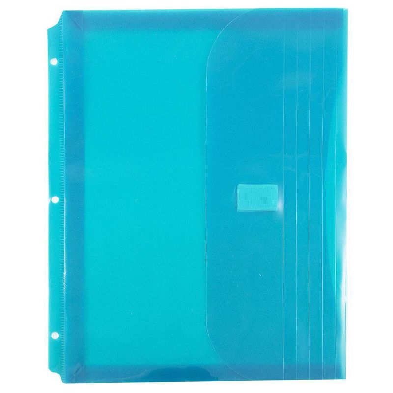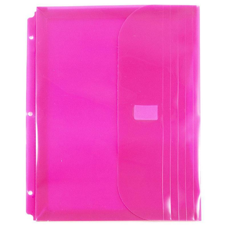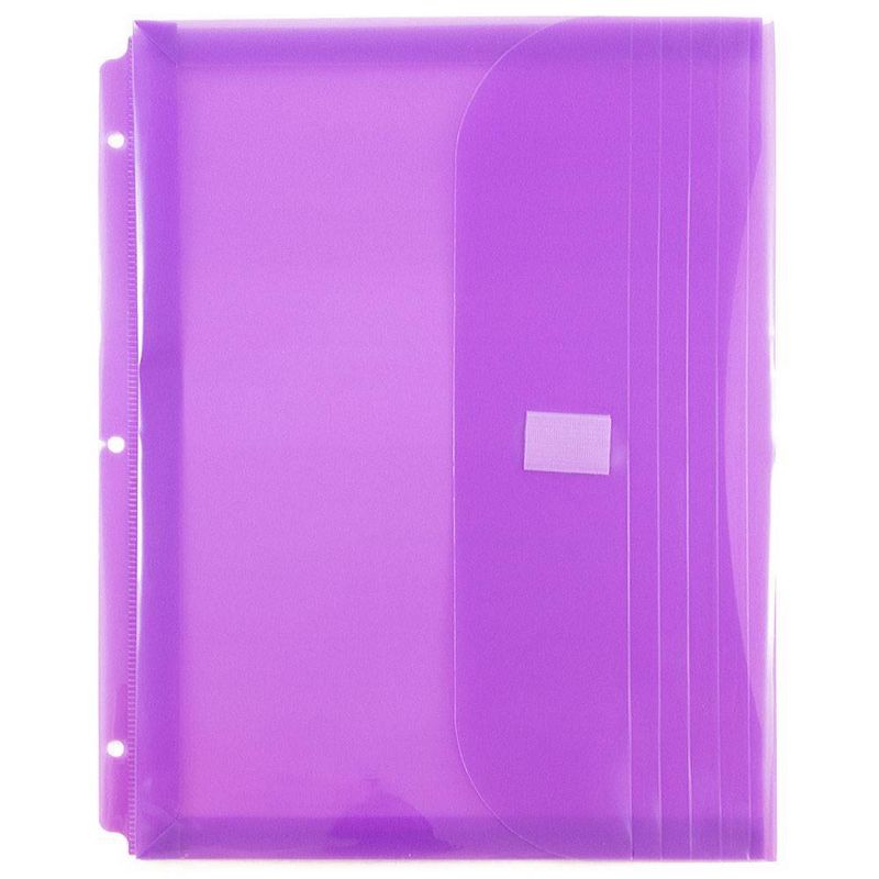 JAM Paper® Letter Booklet Plastic Envelopes with Hook & Loop Closure and 3 Hole Punch are 8 5/8 x 11 1/2 inches in size and have a 1inch expansion. This pack includes 6 envelopes an assortment of Pink, Lilac, and Teal. Each one features 3 holes on the bottom spine, which permit them to fit perfectly into standard sized 3 ring binders. Their certified Hook & Loop Closure ensure that they stay closed tightly and can be opened easily.