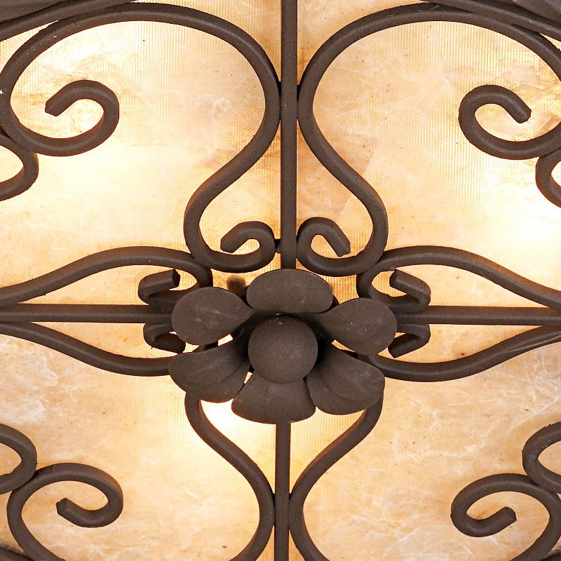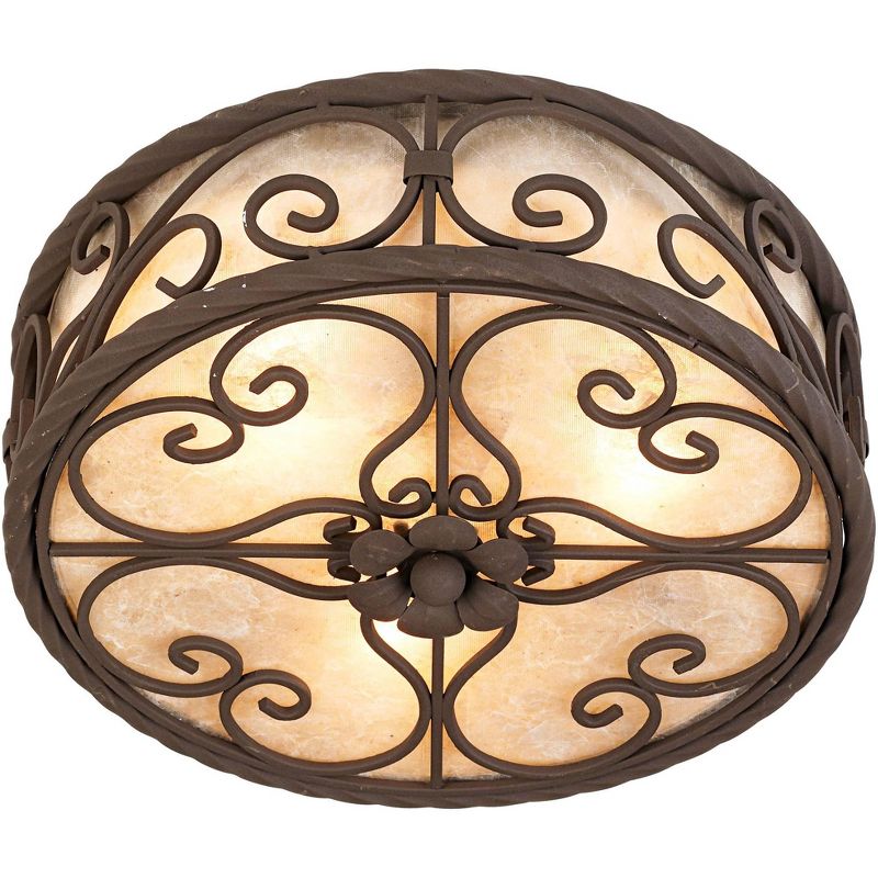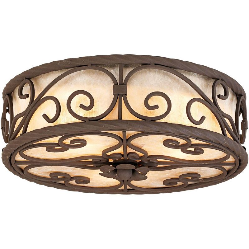 In the grand tradition of the Spanish-influenced Mediterranean style, this design comes from the John Timberland® lighting collection. The iron look metal frame features interlaced scrolls in a dark walnut finish. The shade is fashioned from the naturally occurring mica mineral. Slight variations due to the natural tone and pattern of the mineral make each shade unique.
