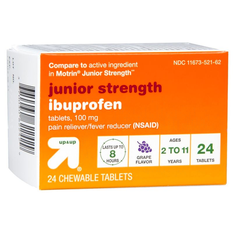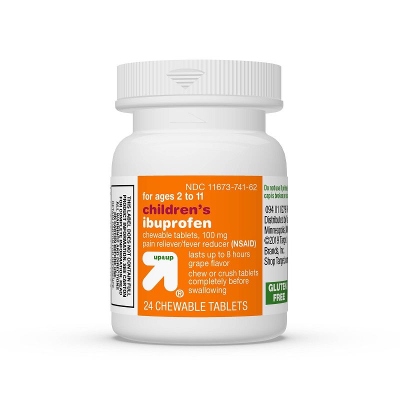 Compare to Children’s Motrin® active ingredient. Children’s Ibuprofen Chewable Tablets, 100 mg, Grape Flavor, active ingredient is ibuprofen 100 mg, a pain reliever and fever reducer for children ages 2 to 11. Ibuprofen is a nonsteroidal anti-inflammatory drug (NSAID) that temporarily reduces fever and provides temporary relief of minor aches and pains due to the common cold, flu, sore throat, headaches and toothaches.