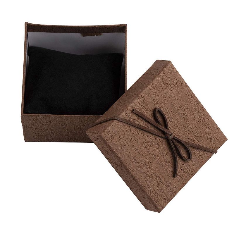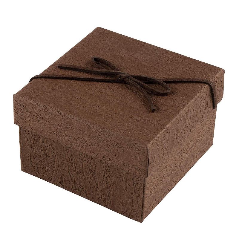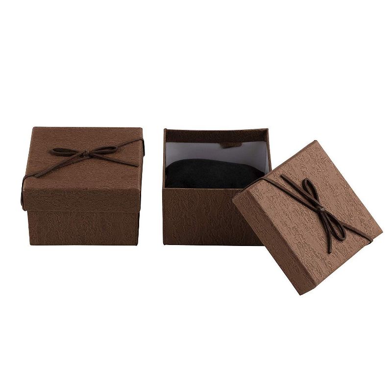This set of 18 jewelry ring boxes features a decorative textured paper design with a synthetic leather bow knot on the lid. They are suitable for a wide range of gifting occasions such as anniversaries, birthdays and Valentine's Day. A soft removable foam pad with a velvet covered surface features ample space to insert your rings, earrings and other small jewelry items comfortably inside. Each box has been designed using durable cardboard material and each lid features a decorative lily flower which adds a sense of classic elegance to each box. Showcase and present your jewelry in a stylish and elegant way. These decorative gift boxes make for an ideal packaging for her, for him, or for a family member, friend or colleague! DIMENSIONS: 3.5 x 3.5 x 2.3 Inches