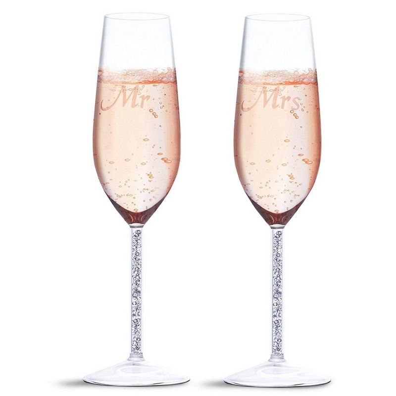 • BRIDE AND GROOM CHAMPAGNE FLUTE GLASSES FOR HIM AND HER, MR. AND MRS: This pair of luxurious and charming Mr. and Mrs. champagne glasses are made of glass and feature artistic bubbles in the stems of each glass