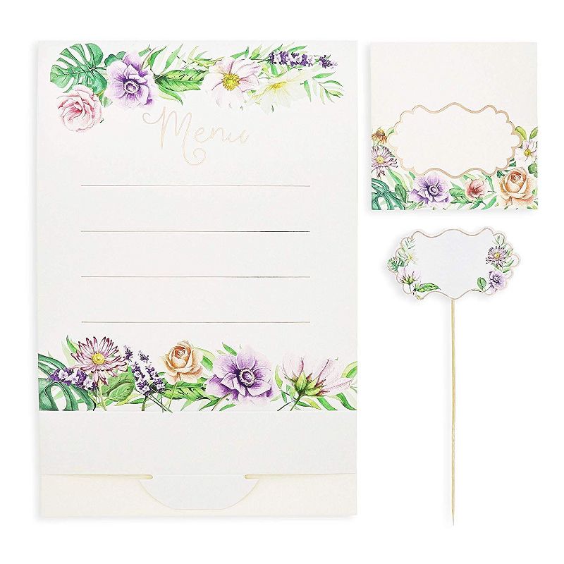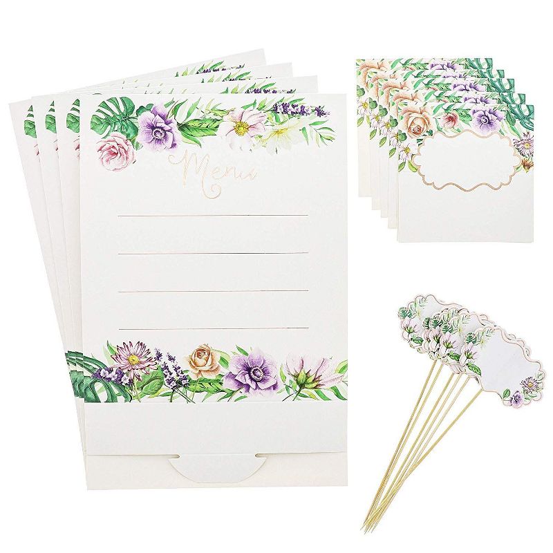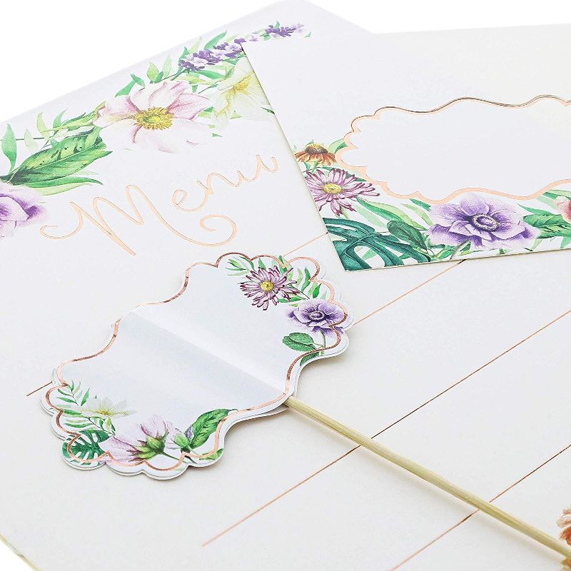 Includes 6 large tent cards labeled "Menu", 6 small non-labeled tent cards, and 12 food picks with blank labels. Features floral design with rose gold foiled accents. Perfect for bridal showers, wedding parties, baby shower, brunch, etc. 300gsm cardstock; non-laminated. Big Tent Card Folded: 7.5 x 3.1 x 8.7 Inches; Small Tent Cards: Folded size: 4 x 2 inches; Picks: 7.25 inches