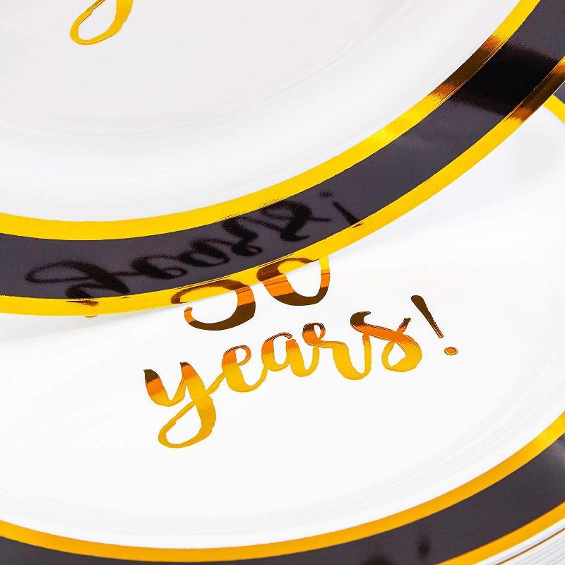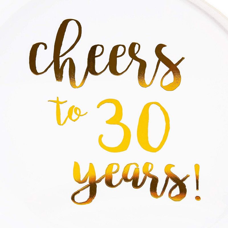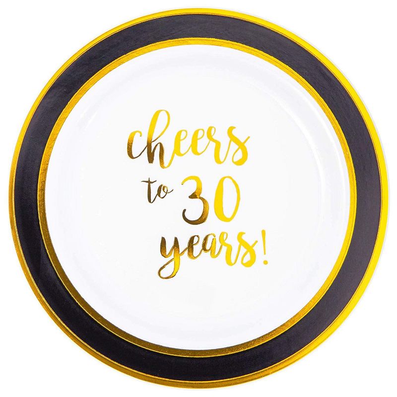 • SERVES 24: Dinnerware set includes enough plates for 24 guests; Featuring Cheers to 30 Years lettering with black and gold foil design