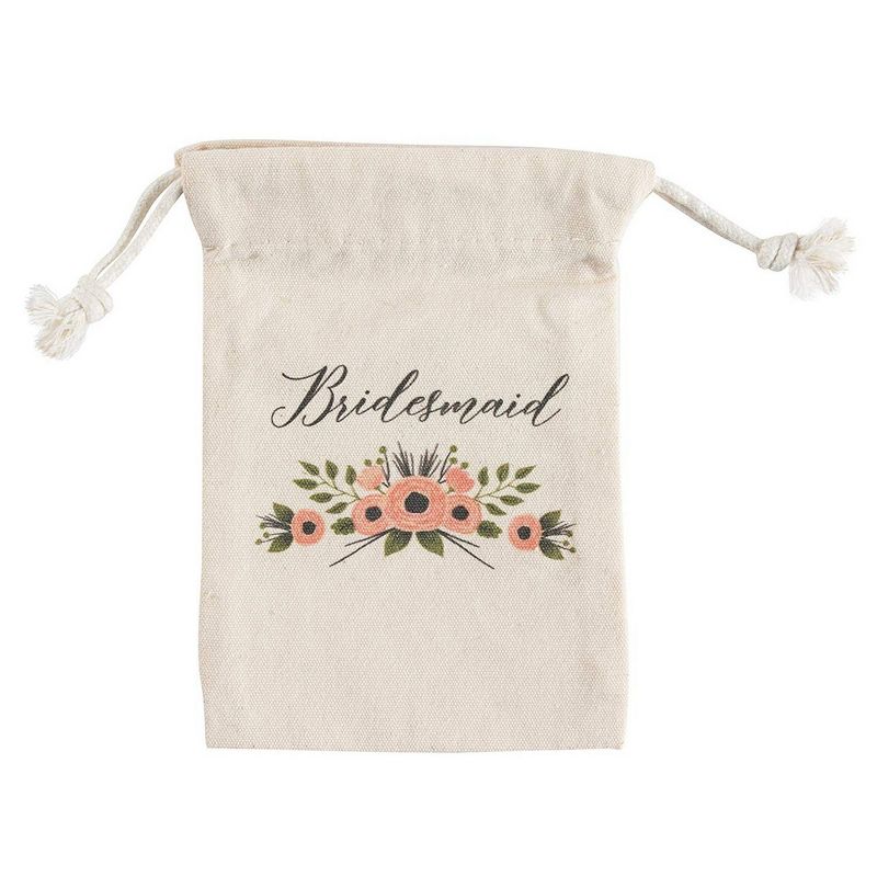 BRIDESMAID BAG SET: Includes 1 canvas tote bag and 1 canvas pouch with drawstring closure. Features a matching "Bridesmaid" print with vintage flower prints to match your elegant bridal party.