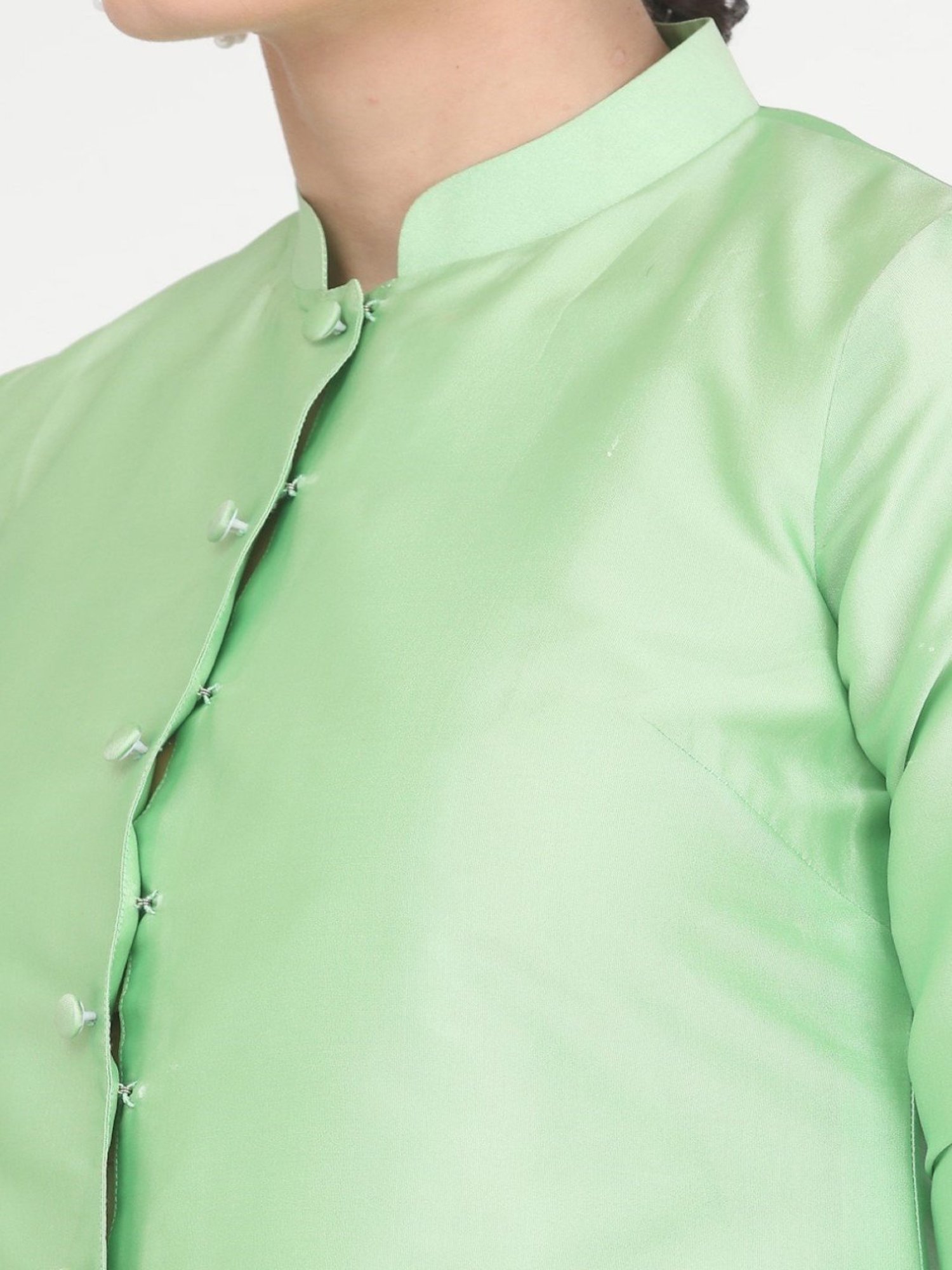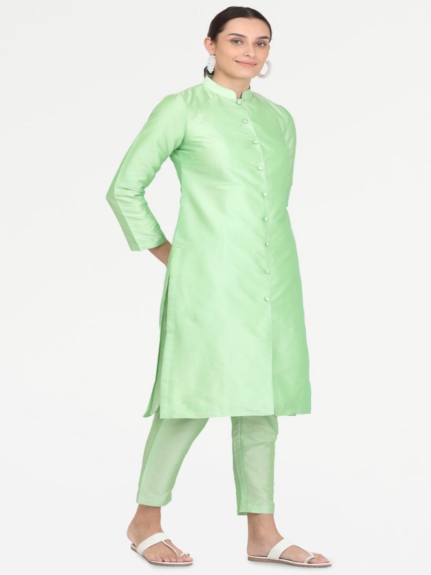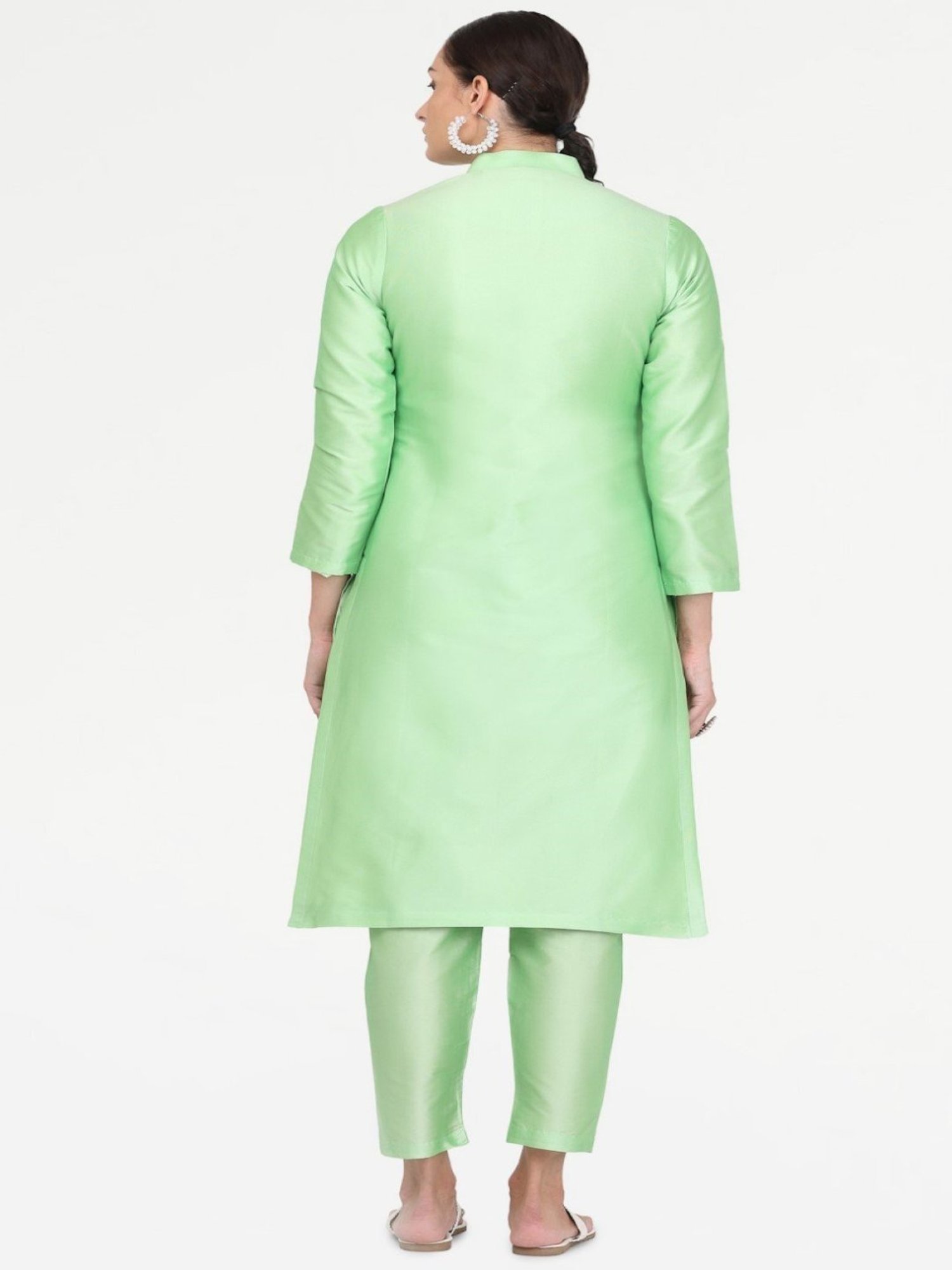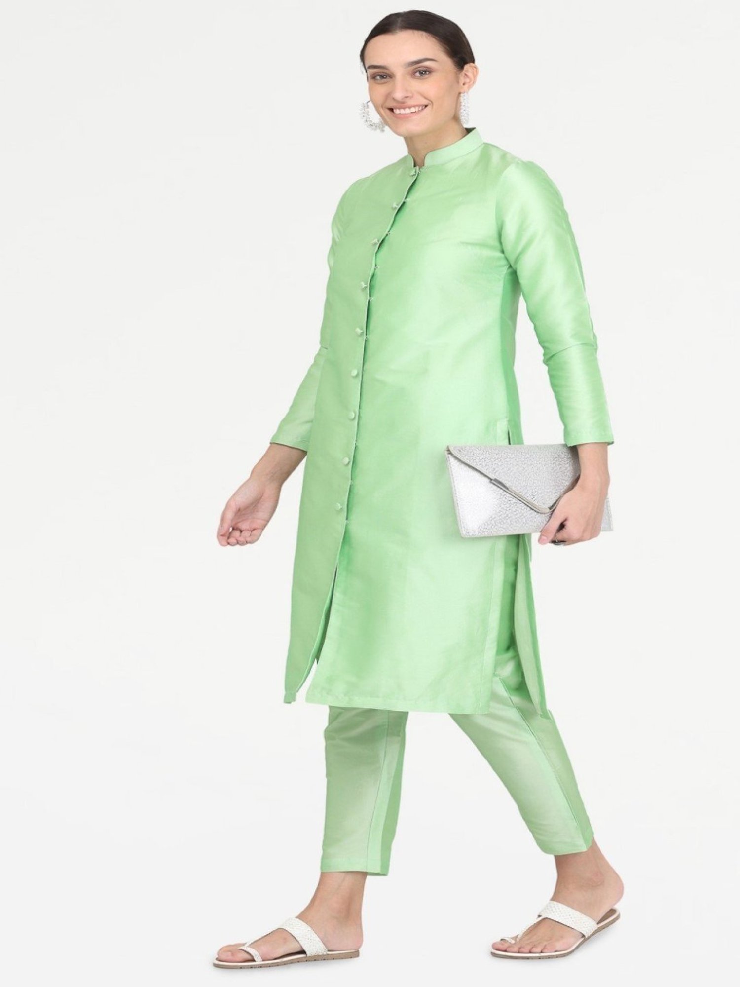Check out this stunning Kaanchie Nanggia Green Taffeta Jacket with Pant for your casual wear! It is designed with 3/4th sleeve featuring a unique taffeta fabric that is guaranteed to keep you comfortable all day. The appealing green colour makes it perfect for any occasion. A must-have for every modern woman's wardrobe! Get yours now.Disclaimer: All other items in the image are only for display purposes and will not be a part of the delivery content. Product colour may slightly vary due to photographic lighting sources. Country of Origin - India.