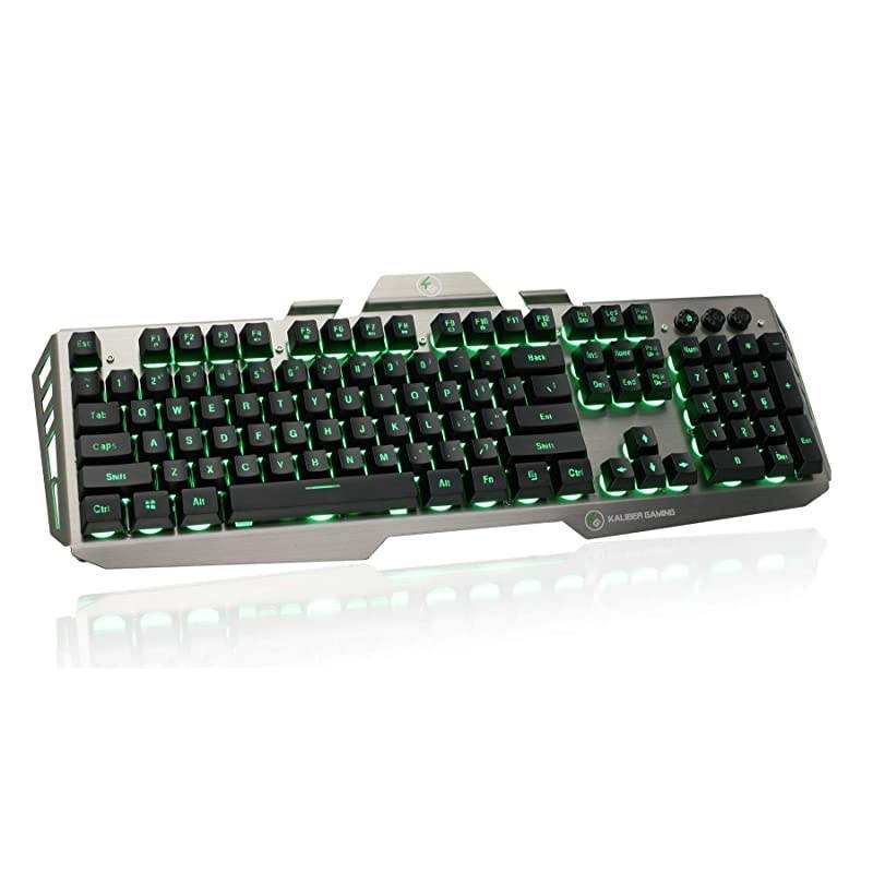 Color: BlackGaming Keyboard with Hover Key Design Kaliber Gaming by is proud to announce the newly designed HVER Aluminum Gaming Keyboard. HVER gets its name from the open frame design with elevated keys that appear to "hover" above the brushed aluminum chassis. Packed with gaming features and good looks, HVER is designed to provide everything gamers need at a price that won't break the bank. HVER's plunger key design provides a solid stroke with that positive feel when engaged- similar to that of a mechanical keyboard. The HVER features premium double injected keycaps for durablility and delivers a lifetime of performance without the key tops ever wearing off. To deliver an exceptional gaming experience, the HVER features 26 anti-ghosting keys, Windows key lockout and a 3-color LED backlighting. HVER comes in two flavors, Imperial White and Black/Gray. 3-Color LED Backlight The HVER Aluminum Gaming Keyboard adds a bit of flare with functionality through the dedicated lighting button. The LED key lets you set your choice of LED backlight colors Aqua, Green or Blue, or select all three and the backlight will slowly pulse while rotating between them.