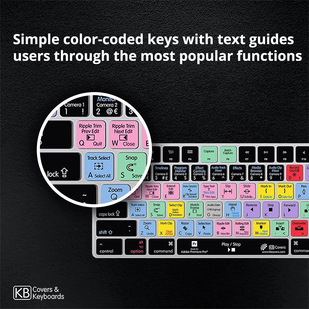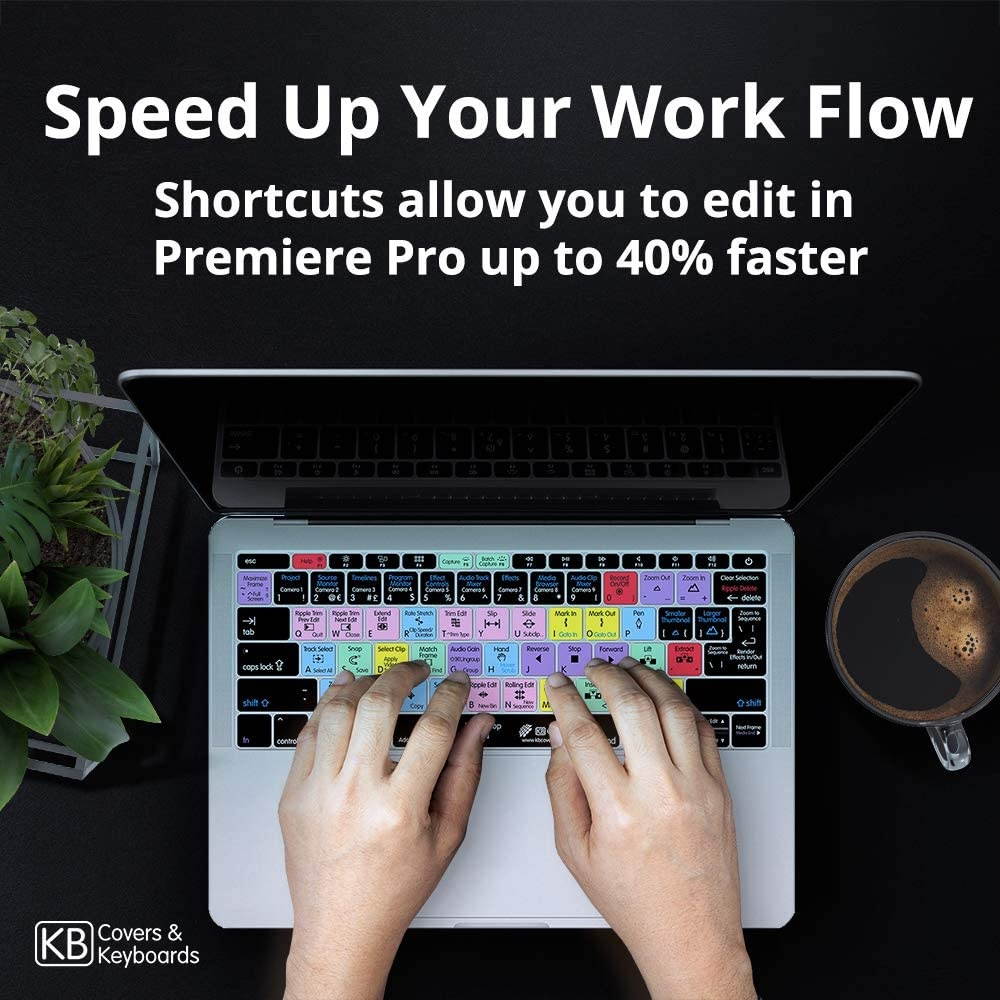 Edit Premiere Pro video files on your Mac faster and easier - without adding a custom external keyboard! This ultra-thin form-fitting keyboard cover does not affect typing ability or speed, and includes custom editing buttons and color-coded shortcuts - right on the keys! So you spend more time editing video and less time learning and memorizing program shortcut keys! Premiere Pro keyboard covers are compatible with Premiere Pro CC and earlier.