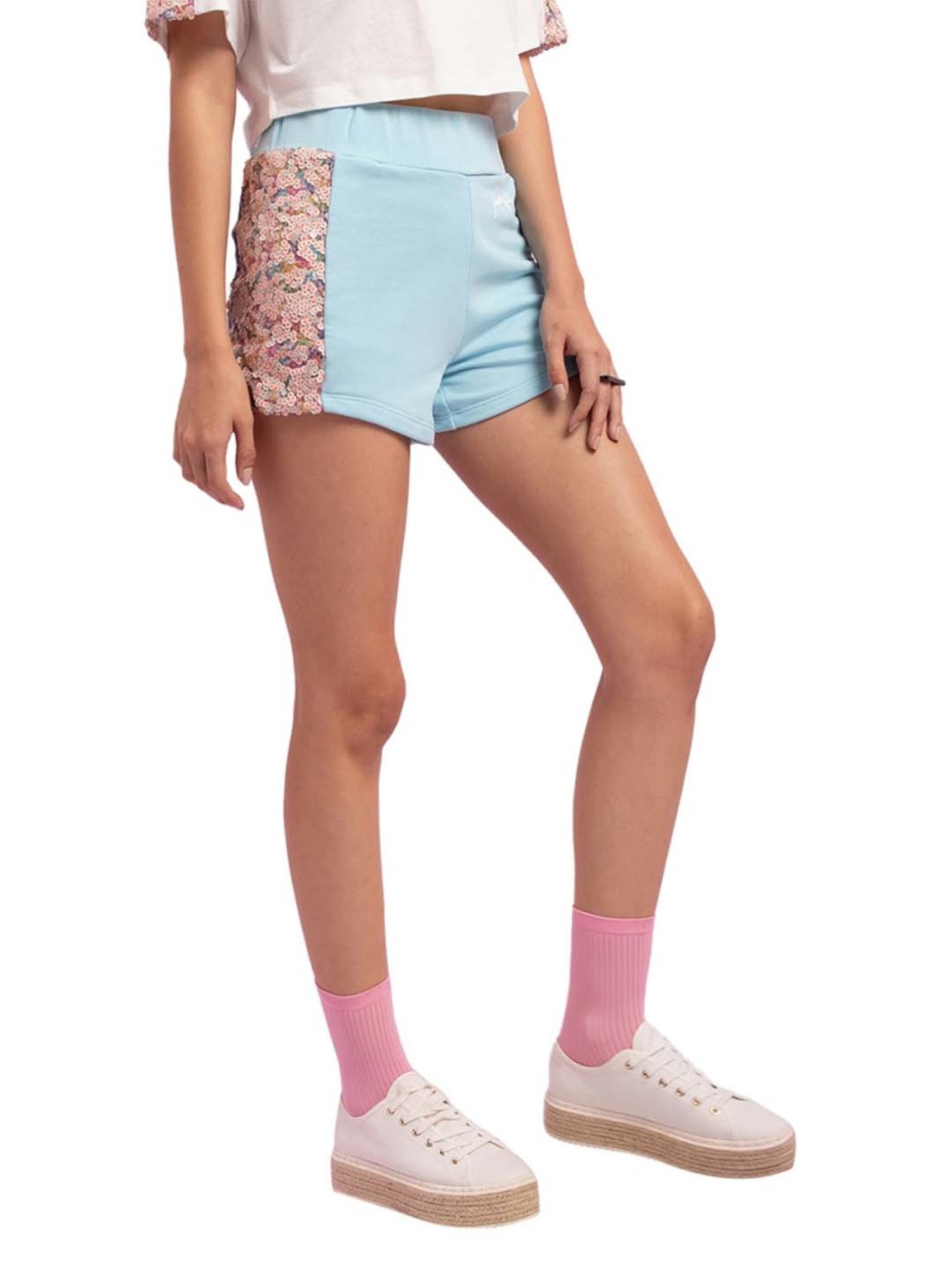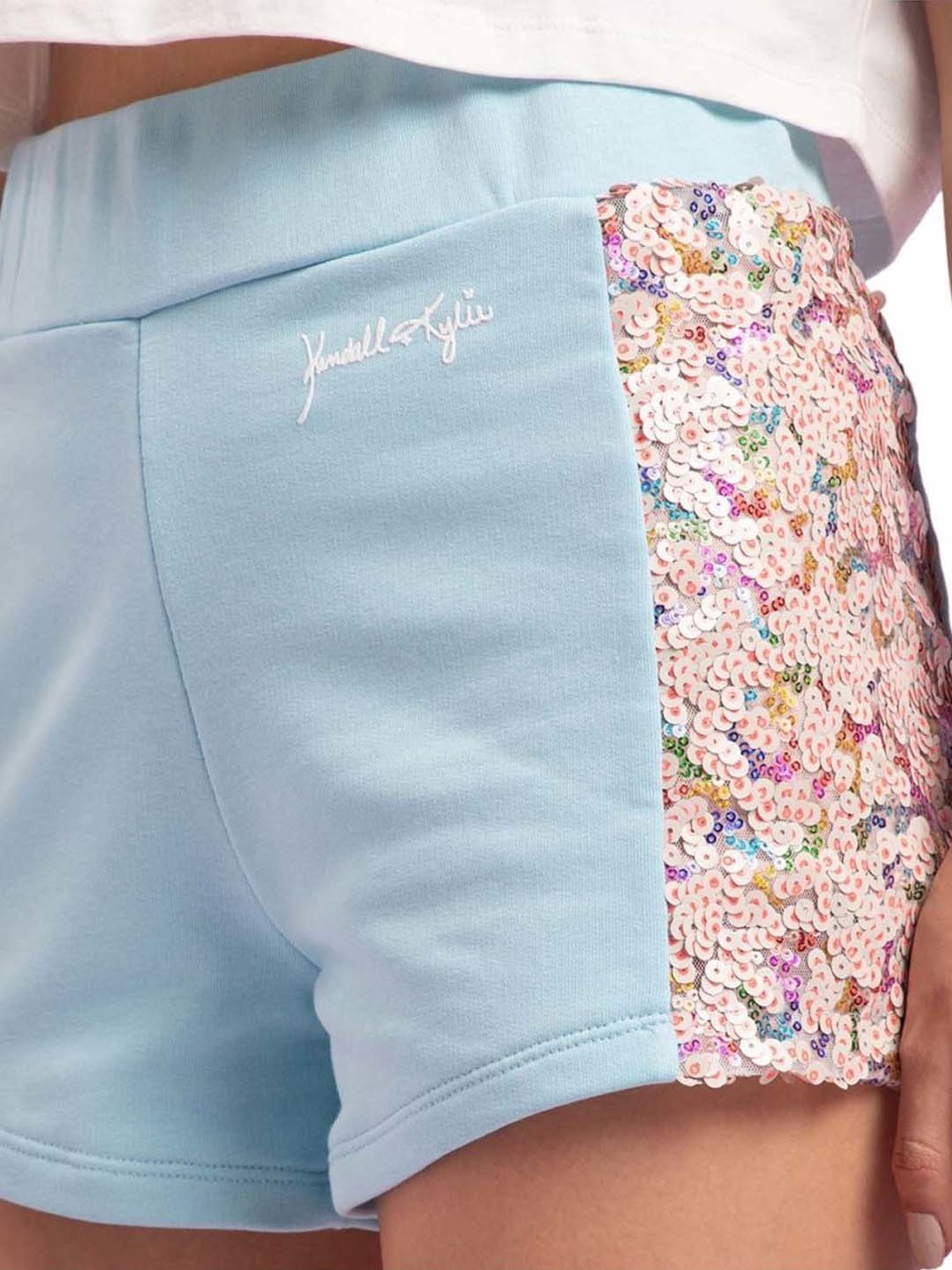 Pep up your wardrobe with this pair of blue shorts from KENDALL + KYLIE. Tailored to sartorial perfection from premium quality fabric, it assures a soft and soothing touch against the skin. The embellished pattern makes it an eccentric choice.