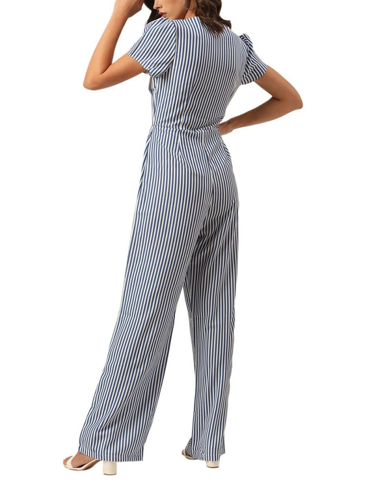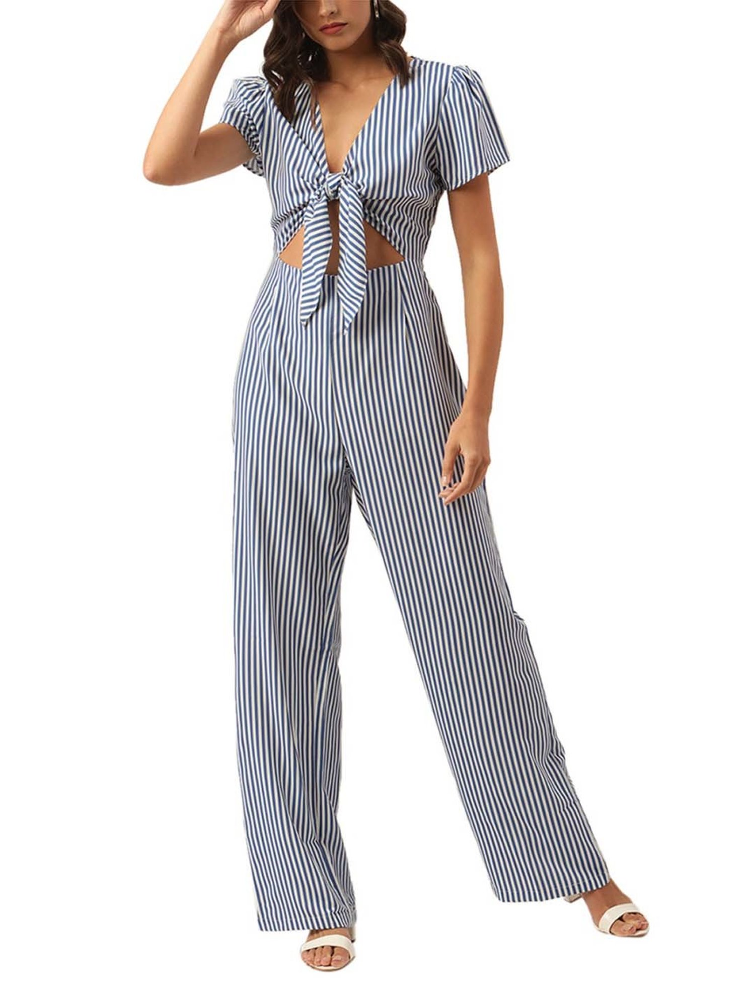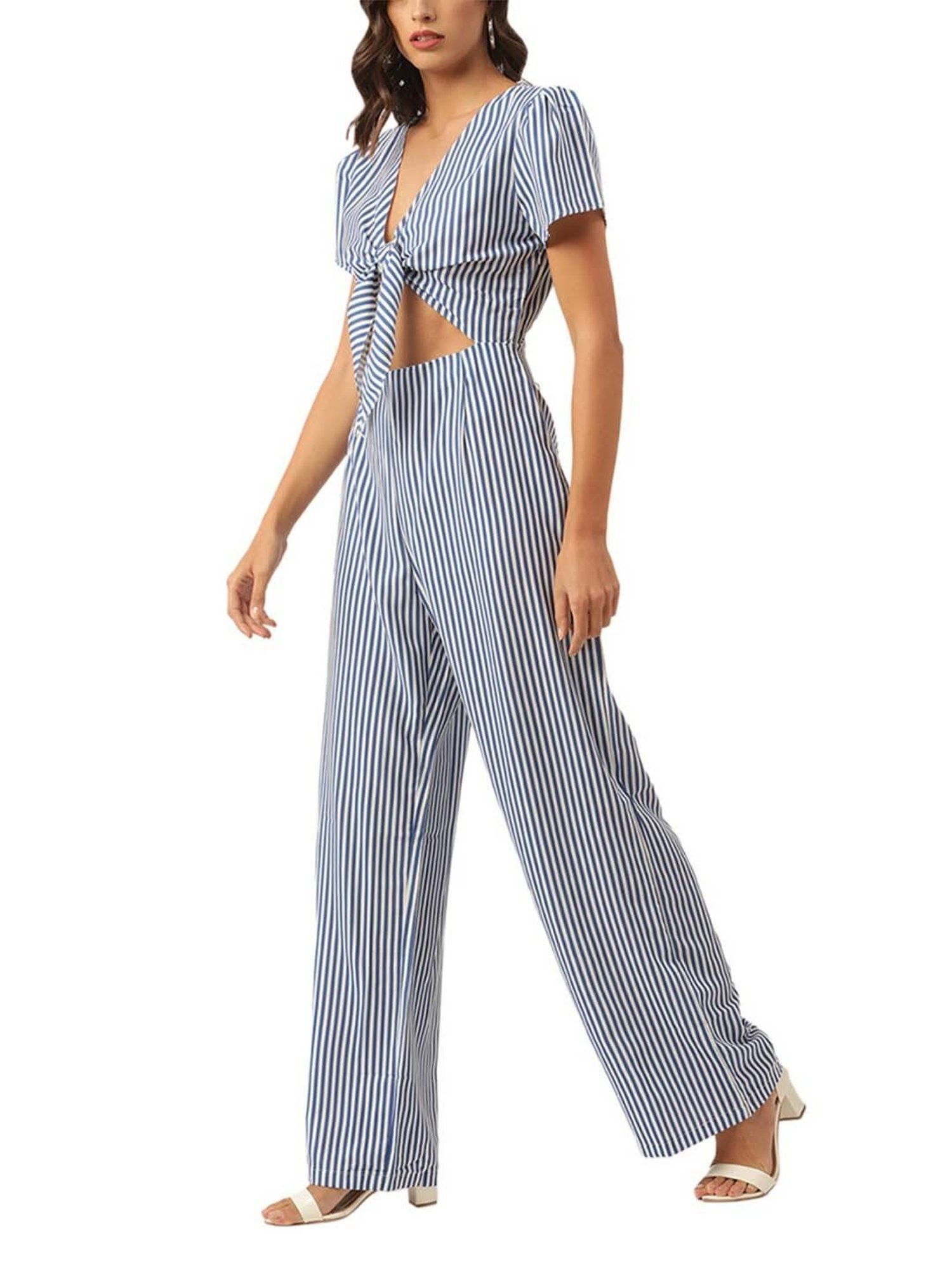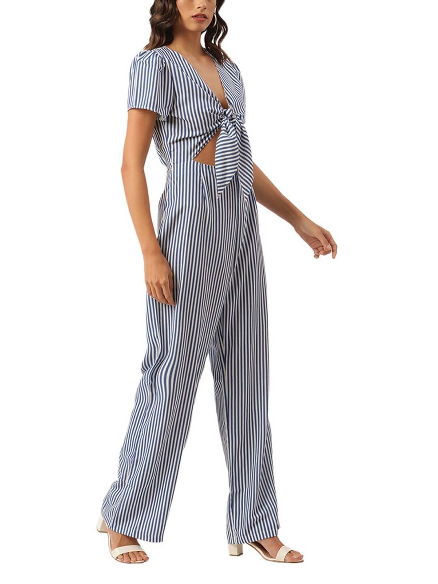 Hit the roads in style by wearing this blue and white jumpsuit from KENDALL + KYLIE. Tailored to sartorial perfection from premium quality fabric, it assures a soft and soothing touch against the skin. The V-neckline adds to its appeal. Exuding short sleeves, it is sure to fetch you compliments from all. It emanates a striped pattern which makes it a unique choice.