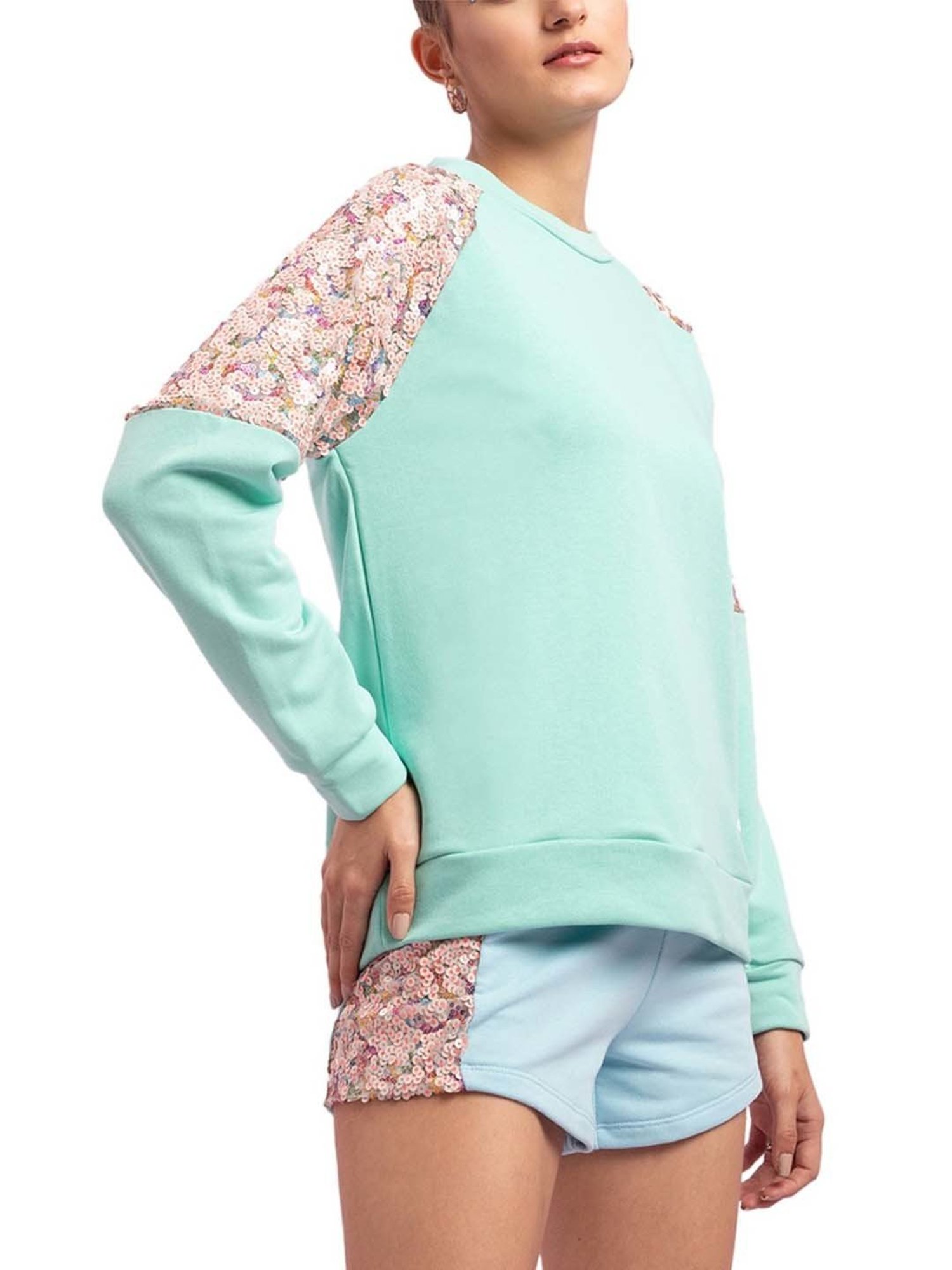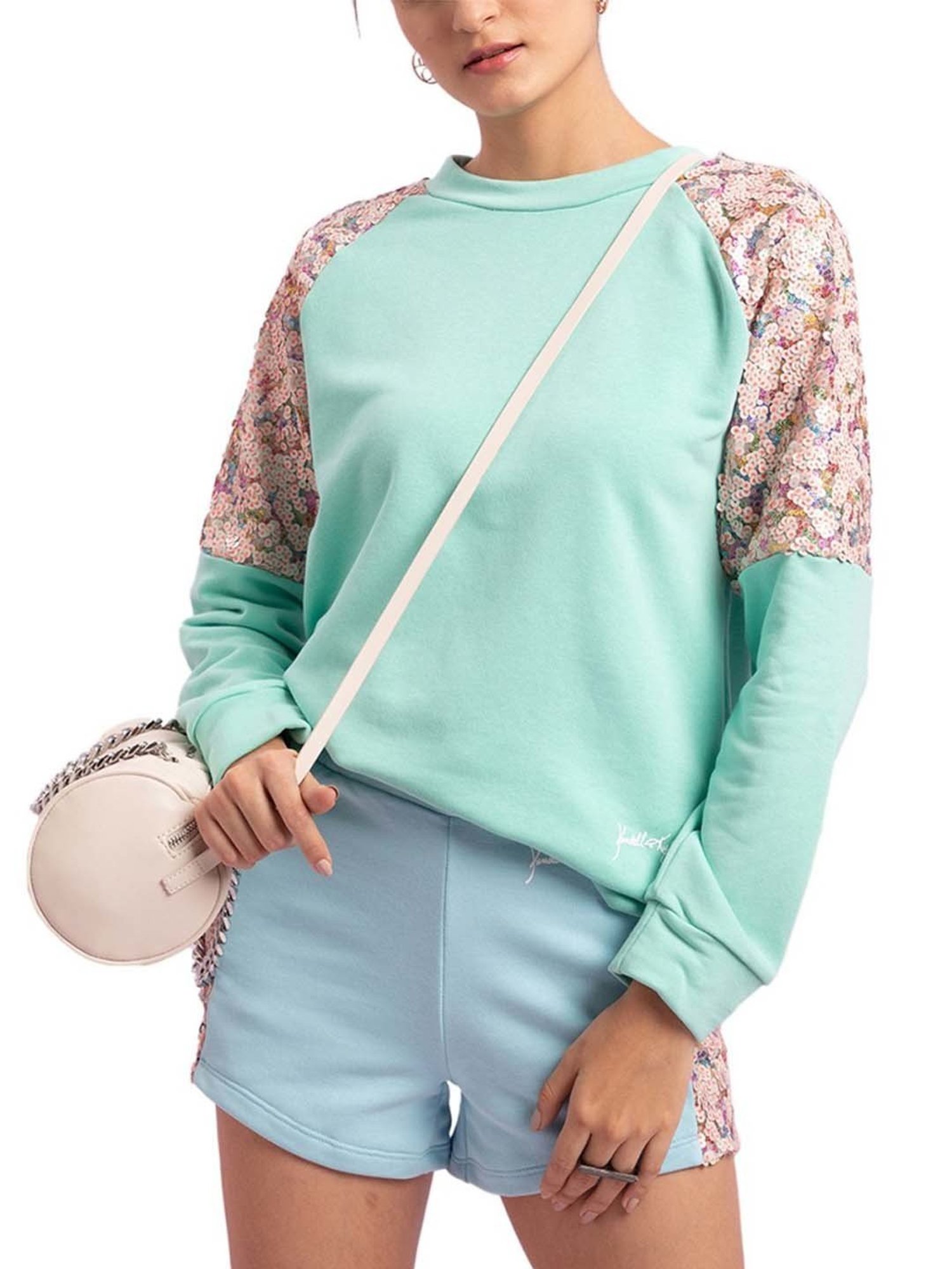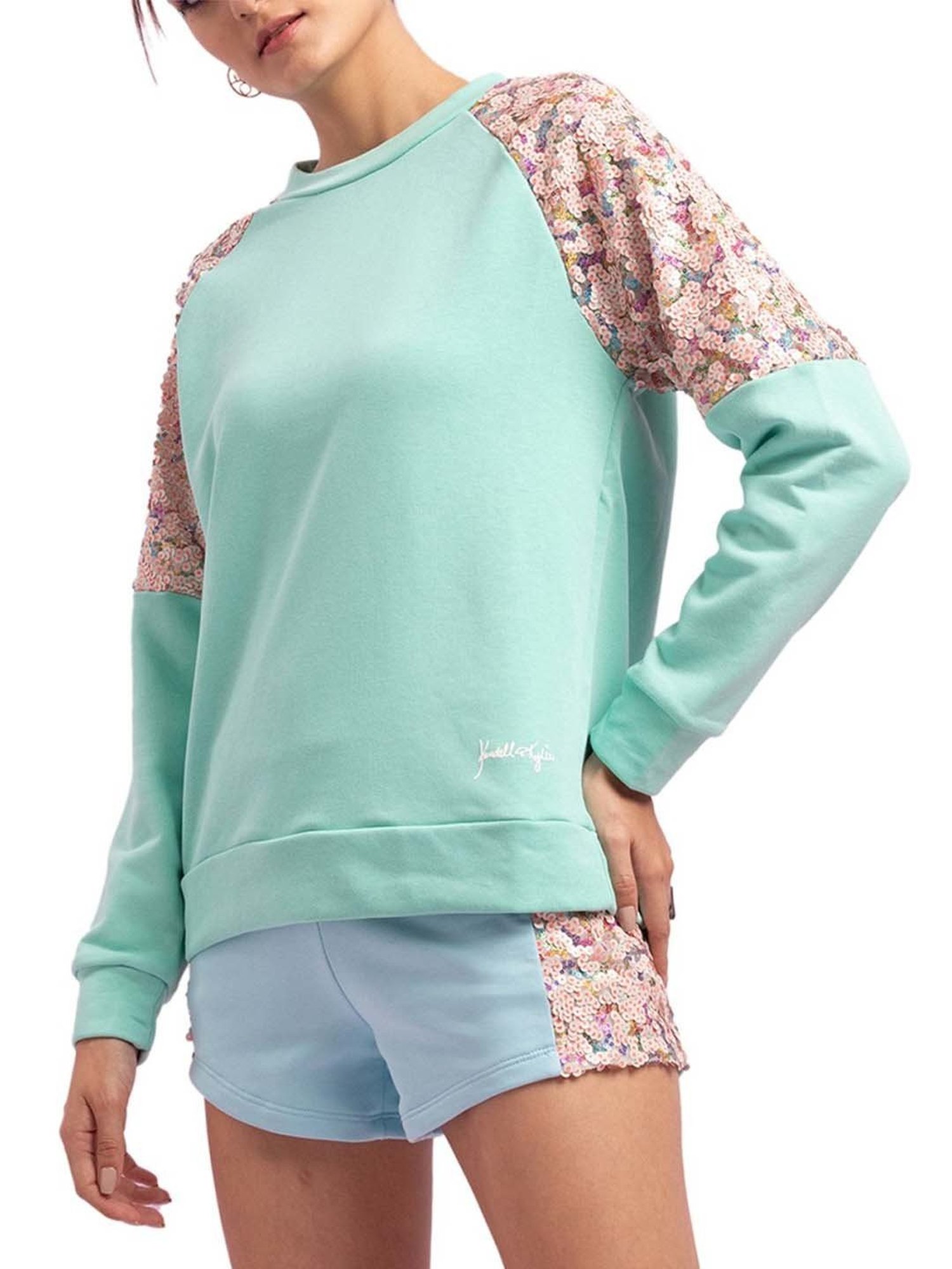 Captivate the mob by wearing this green sweatshirt from KENDALL + KYLIE. Tailored to sartorial perfection from premium quality fabric, it assures a soft and soothing touch against the skin. The round neck adds to its appeal. Exuding full sleeves, it is sure to fetch you compliments from all. The embellished pattern makes it an eccentric choice.